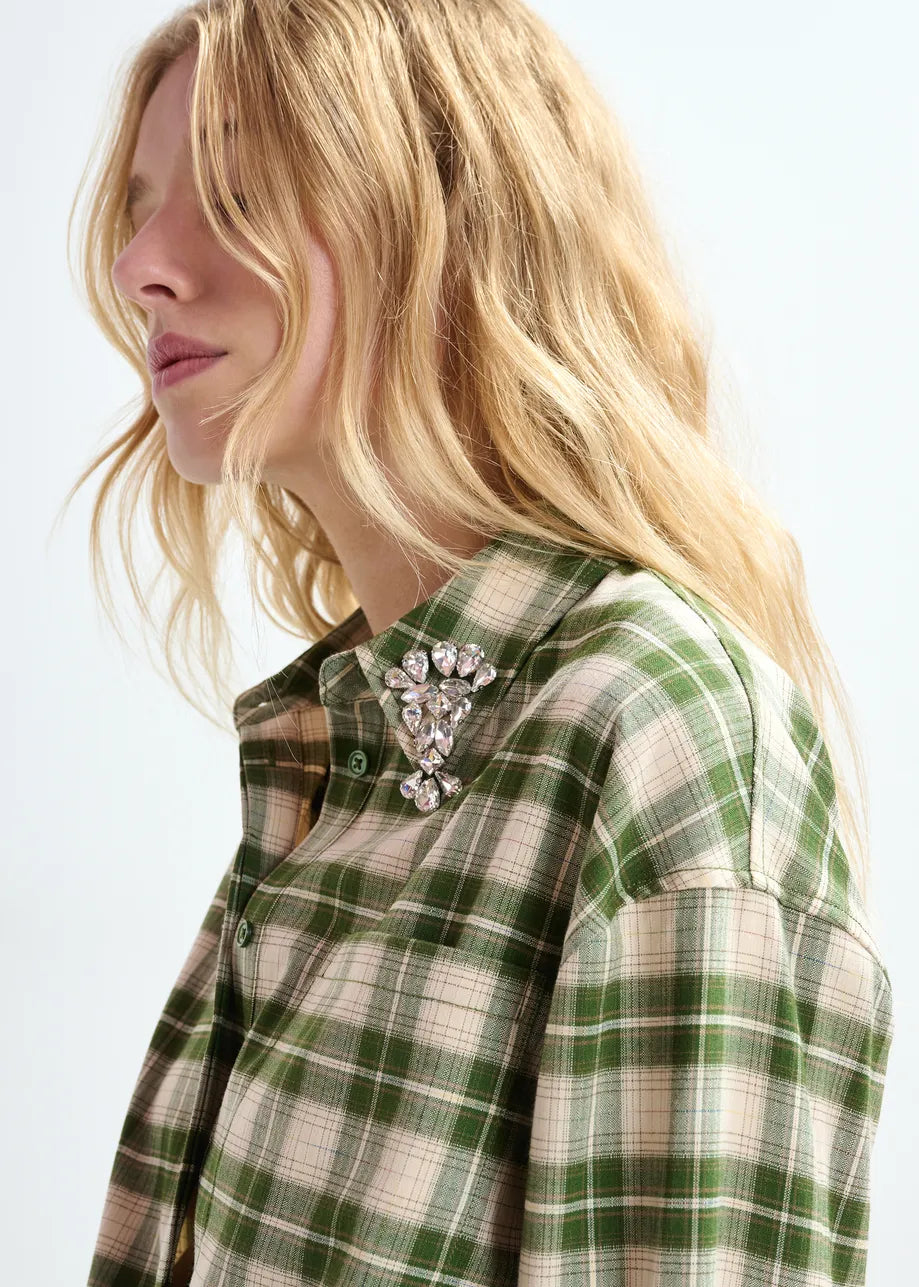 Checked maxi dress, designed with an effortless oversized fit for relaxed elegance. Featuring a concealed button placket, practical chest pocket, and adjustable drawstring waist for a customizable silhouette. The drawstring can be tied in different waysfront, back, or sidefor versatile styling. The classic collar is elevated with sparkling rhinestone embellishments.