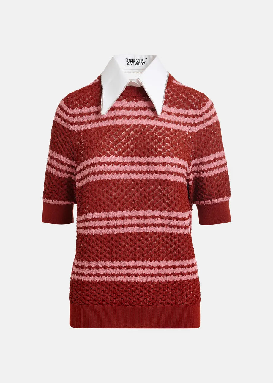 Crafted from a lightweight blend containing recycled polyester, this short-sleeved polo showcases a refined honeycomb knit technique that creates a subtly raised texture and airy structure. Alternating tonal stripes lend a dimensional look to the fabric. Designed for a relaxed fit and ribbed hem and cuffs, the piece is elevated by a crisp, detachable cotton collar. The pointed collar is adorned with delicate rhinestone embellishments and fastens neatly at the back with a small button closure, allowing versatile styling options.