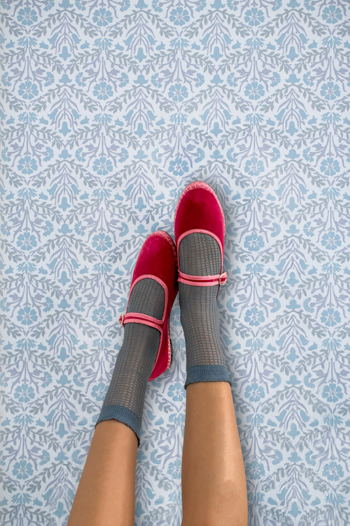 The outside of the shoe is 100% cotton velvet, and the inside of the shoe is 100% organic cotton with anti-bacterial treatment.