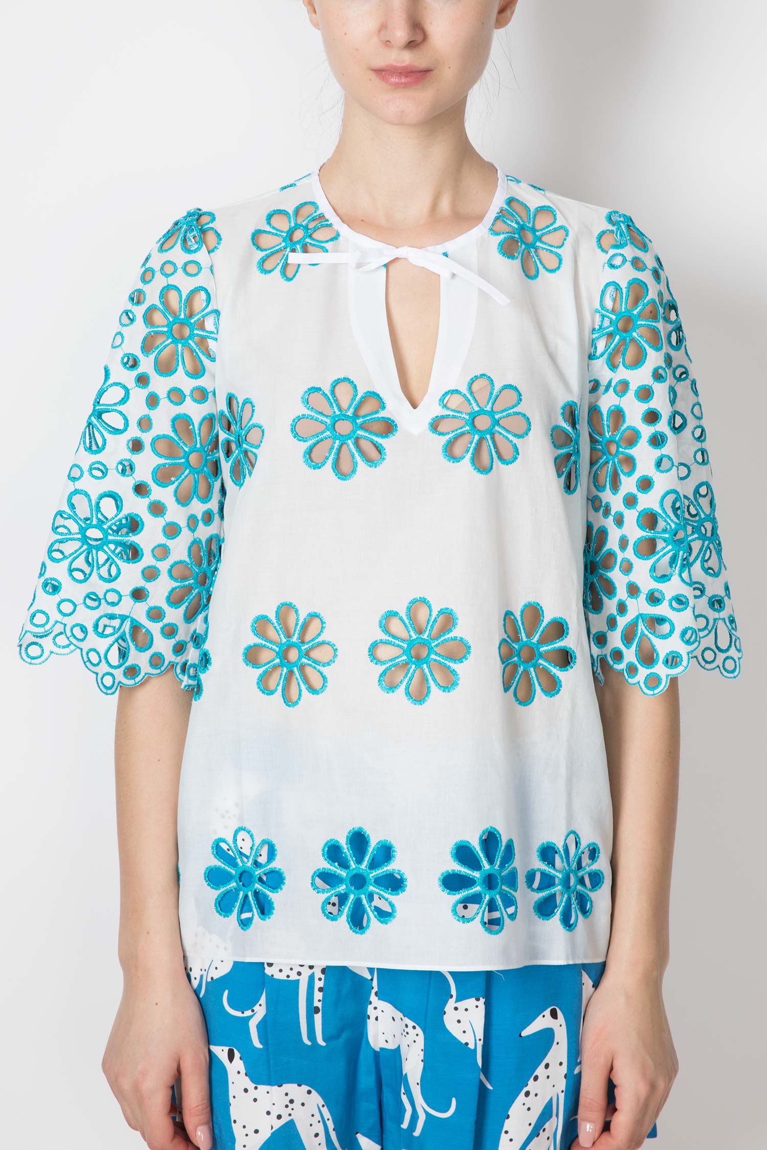Embroidered all over with eyelet floral embroideries, this top with loose-fit cutting is finished with contrasted colour and a delicate self-tie ribbon at the collar. Medium sleeves. Model is 177cm tall and wears size S.