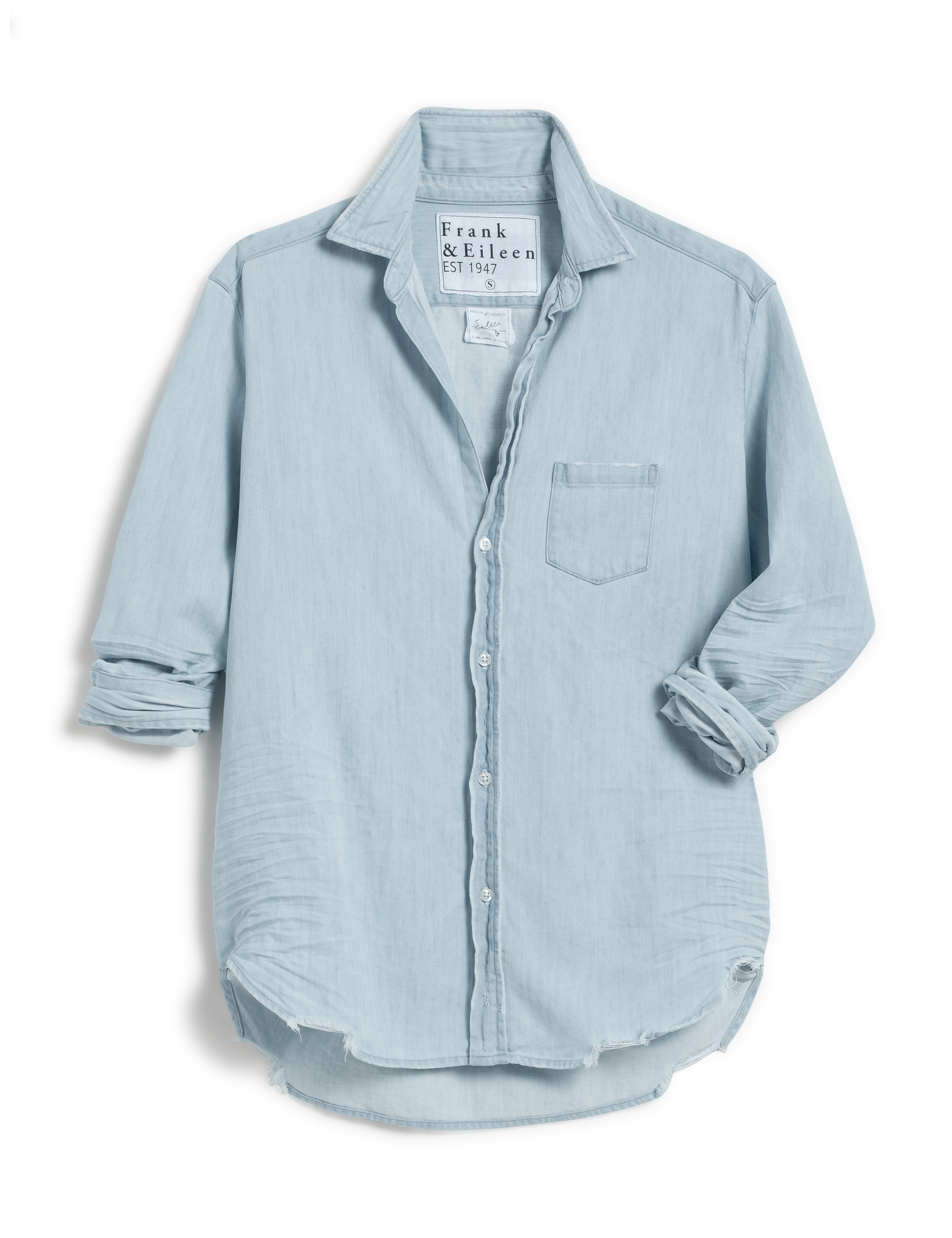Hand-distressed raw shirttail hem long enough to cover your bumShaped like a circle with soft rounded shoulders and no back pleatChest pocketSignature bust flattering button placement and long sleeves with button cuffsPaloma is 5'9" with a 34" bust wearing a size SFamous Denim is hand-dyed and distressed for a one-of-a-kind garment and may vary slightly. Turn this garment inside out, machine wash on cold with like colors, and tumble dry on low. Style Code: EILEEN-RQCD