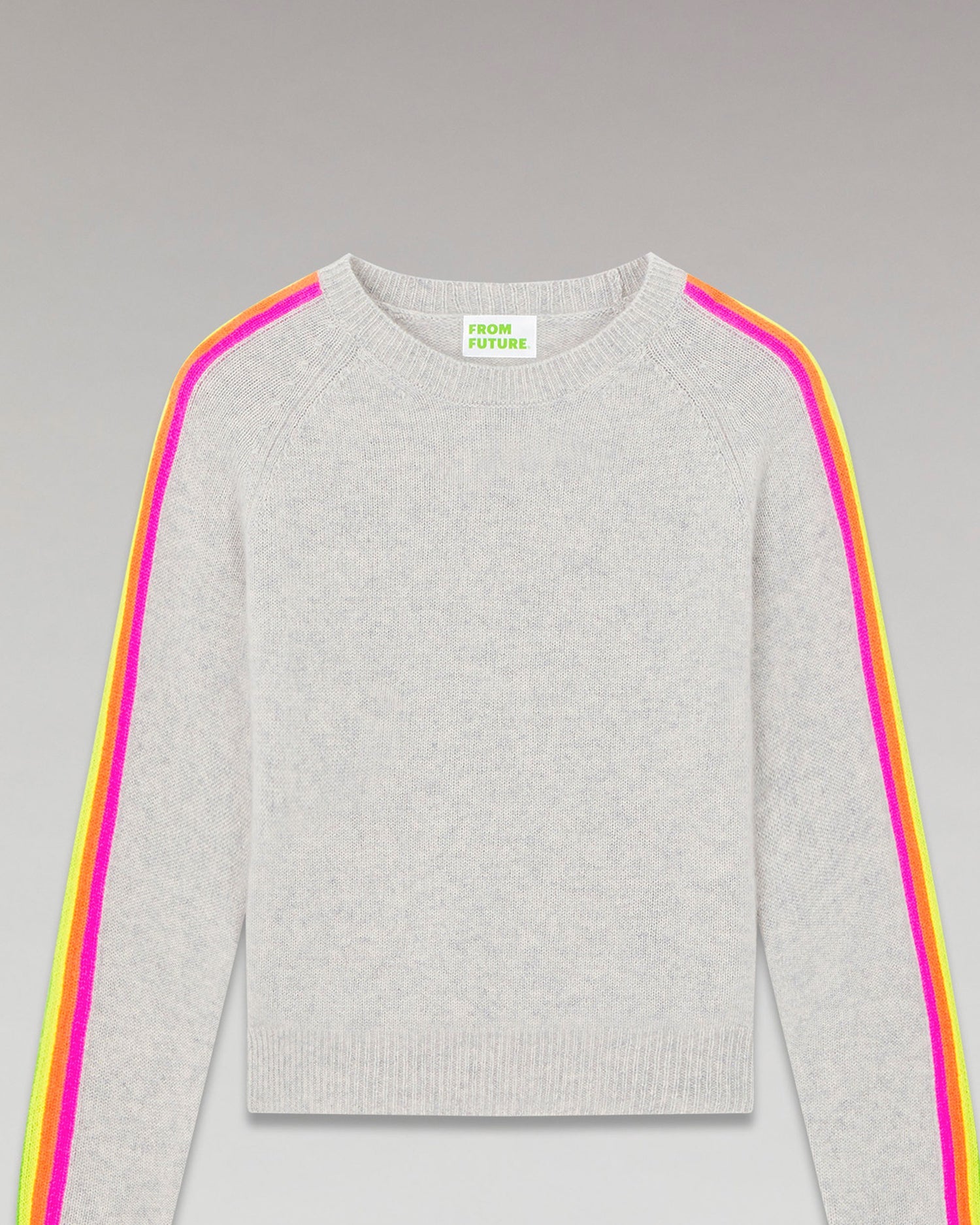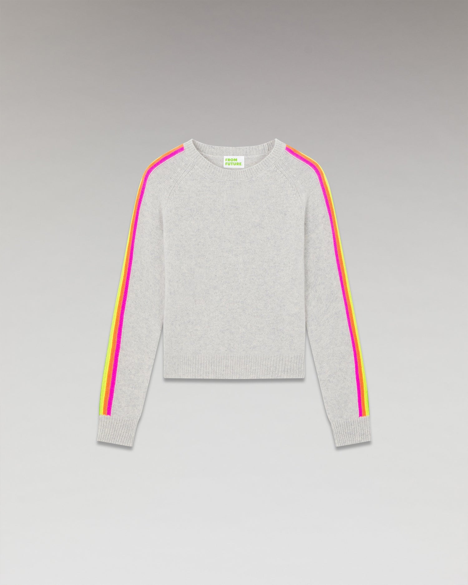 Let yourself be carried away to infinite horizons with this cropped sweater, featuring a round neck and ribbed edges. Infinitely soft, it adopts a 100% 4-thread cashmere knit to warm your figure with style. The daring detail? Multicolored bands appear along the sleeves and announce a more than bright future! Casual and elegant, it can be worn with a t-shirt, wide, flowing pants and sneakers.