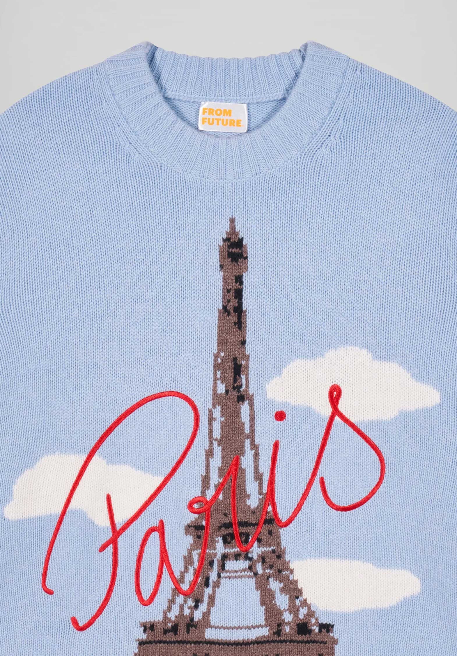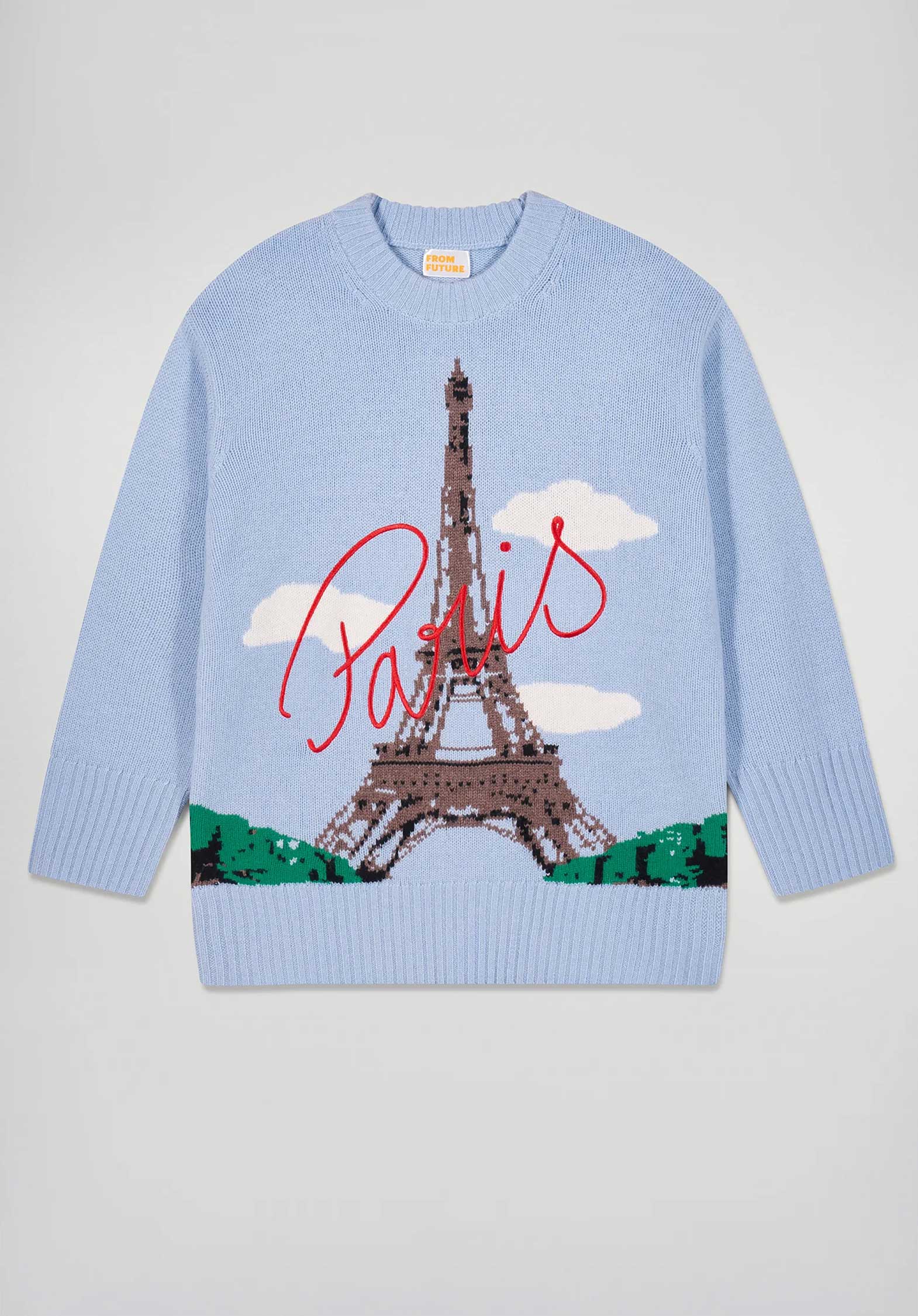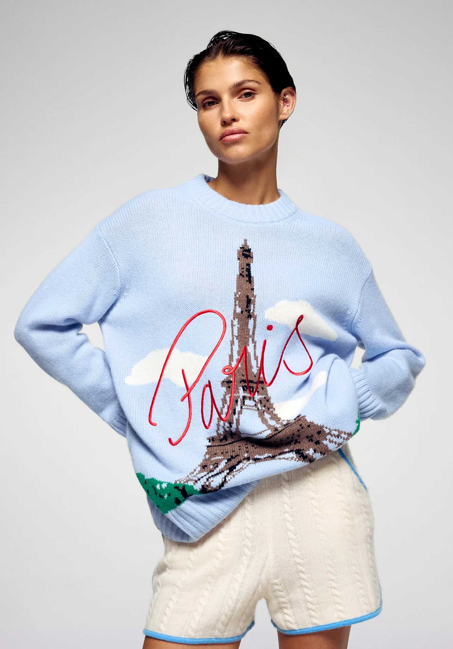 - Women's 4-thread cashmere sweater - Intarsia Eiffel Tower - "Paris" embroidery - Round neck - Long sleeves - Oversize cut