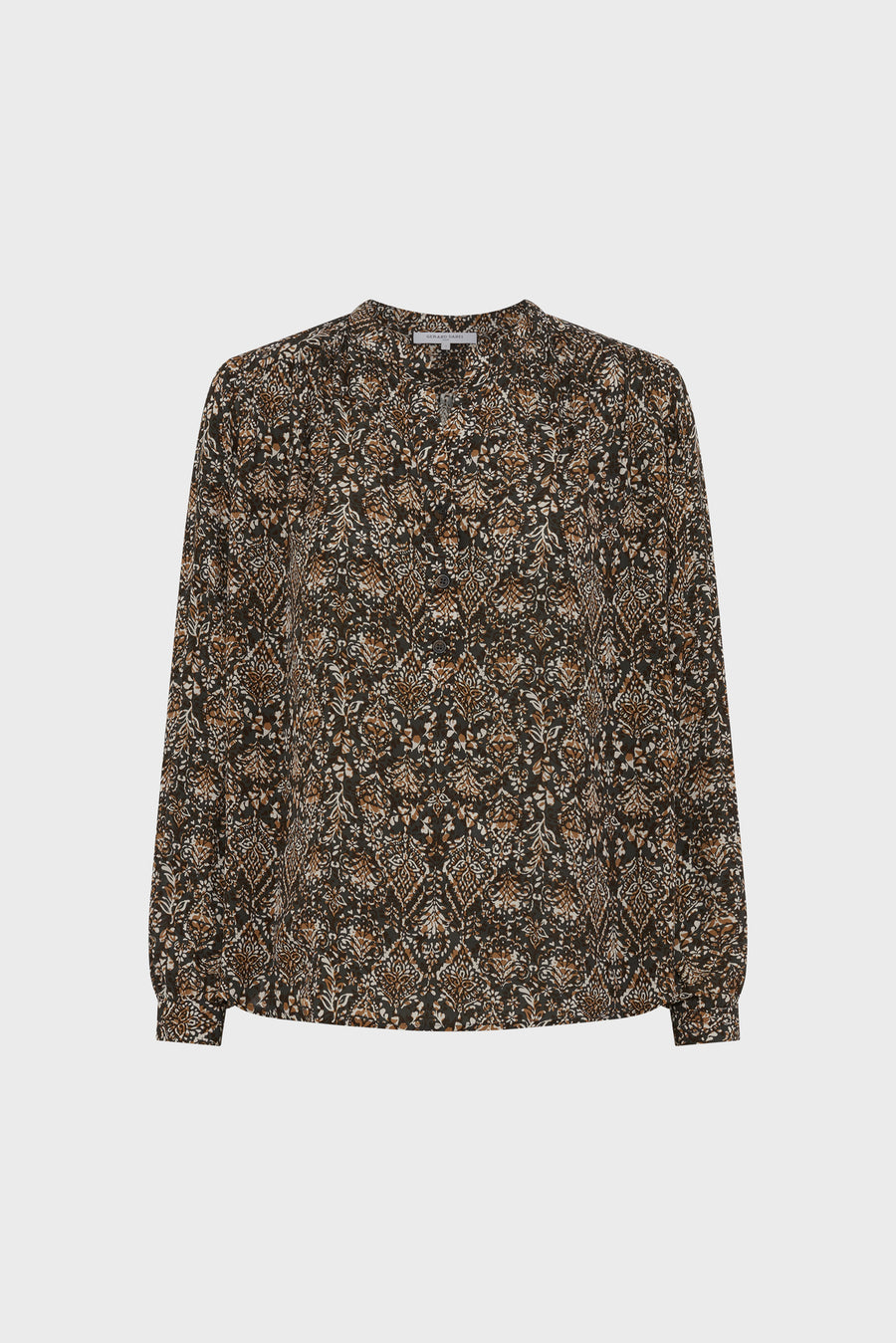 PRINTED BLOUSE IN KHAKI TONES FOR A BOHO - CHIC FEEL. MADE FROM A SOFT, FLOWING FABRIC, WITH TUNISIAN COLLAR.