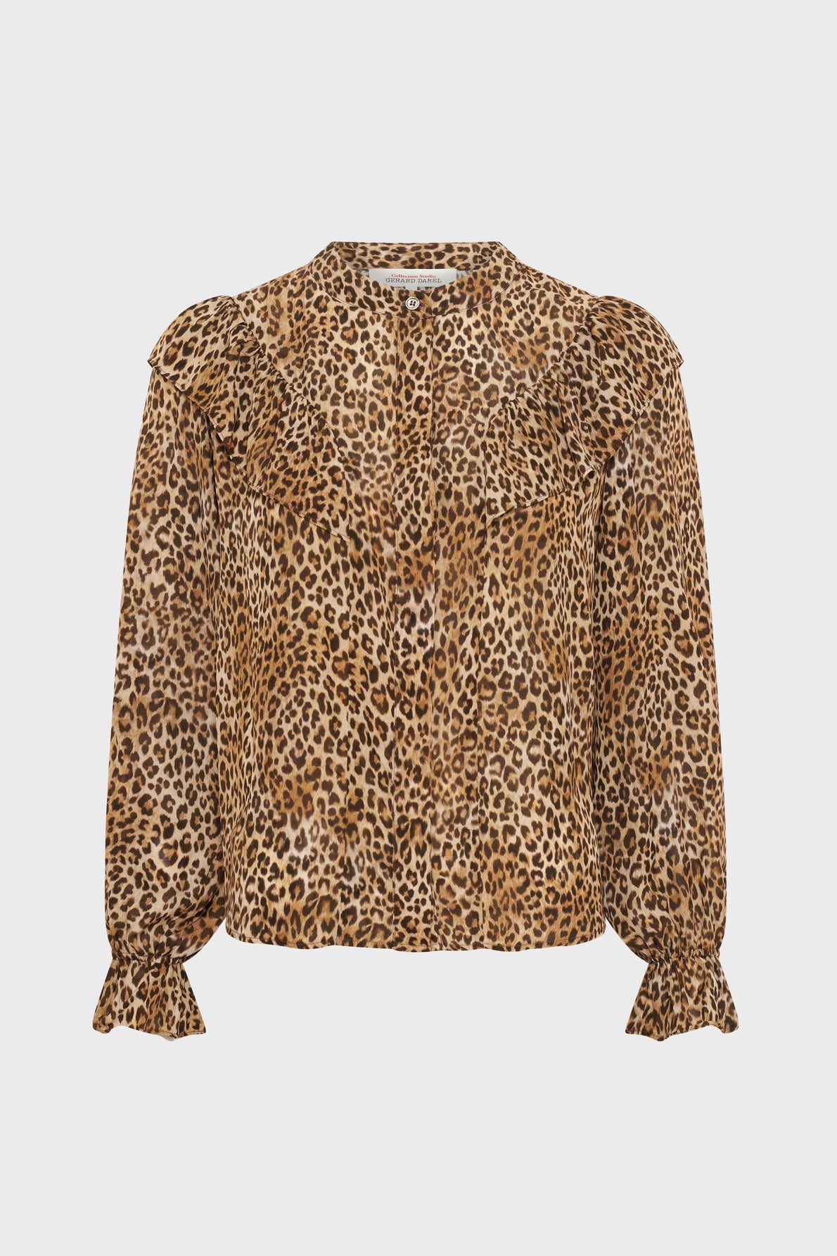 CRAFTED FROM A SMOOTH AND FLUID MATERIAL, THE ARLETTY SHIRT STANDS OUT WITH ITS LEOPARD PATTERN, SET OF RUFFLES, AND PLEATS.