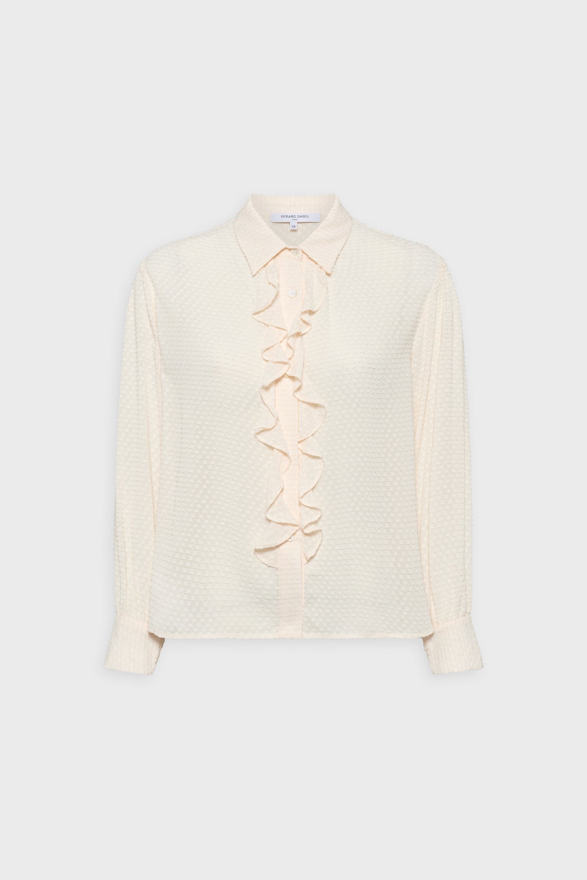 ECRU SHIRT WITH JACQUARD PATTERN OF SMALL SQUARES, AND JABOT ALONG THE BUTTON PLACKET. CAN BE WORN WITH A BLACK BLAZER FOR A MORE SOPHISTICATED LOOK.