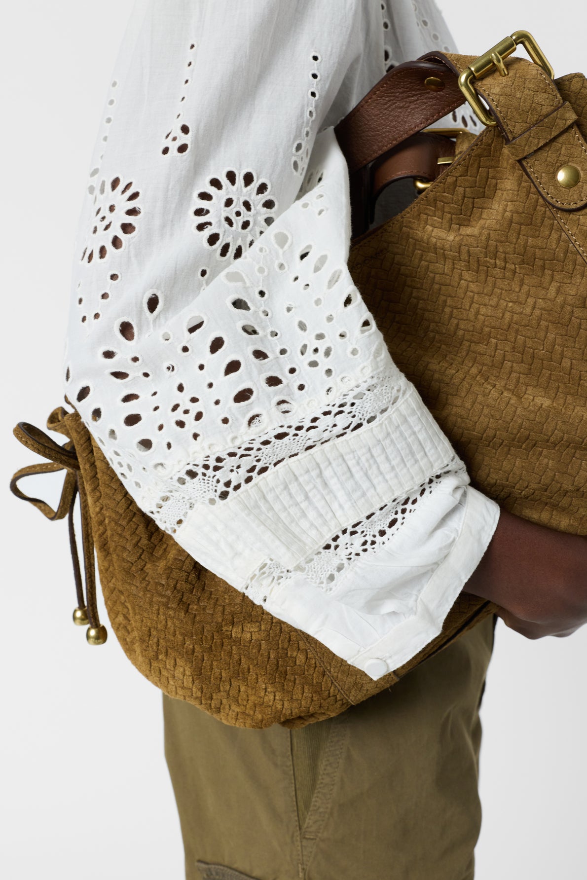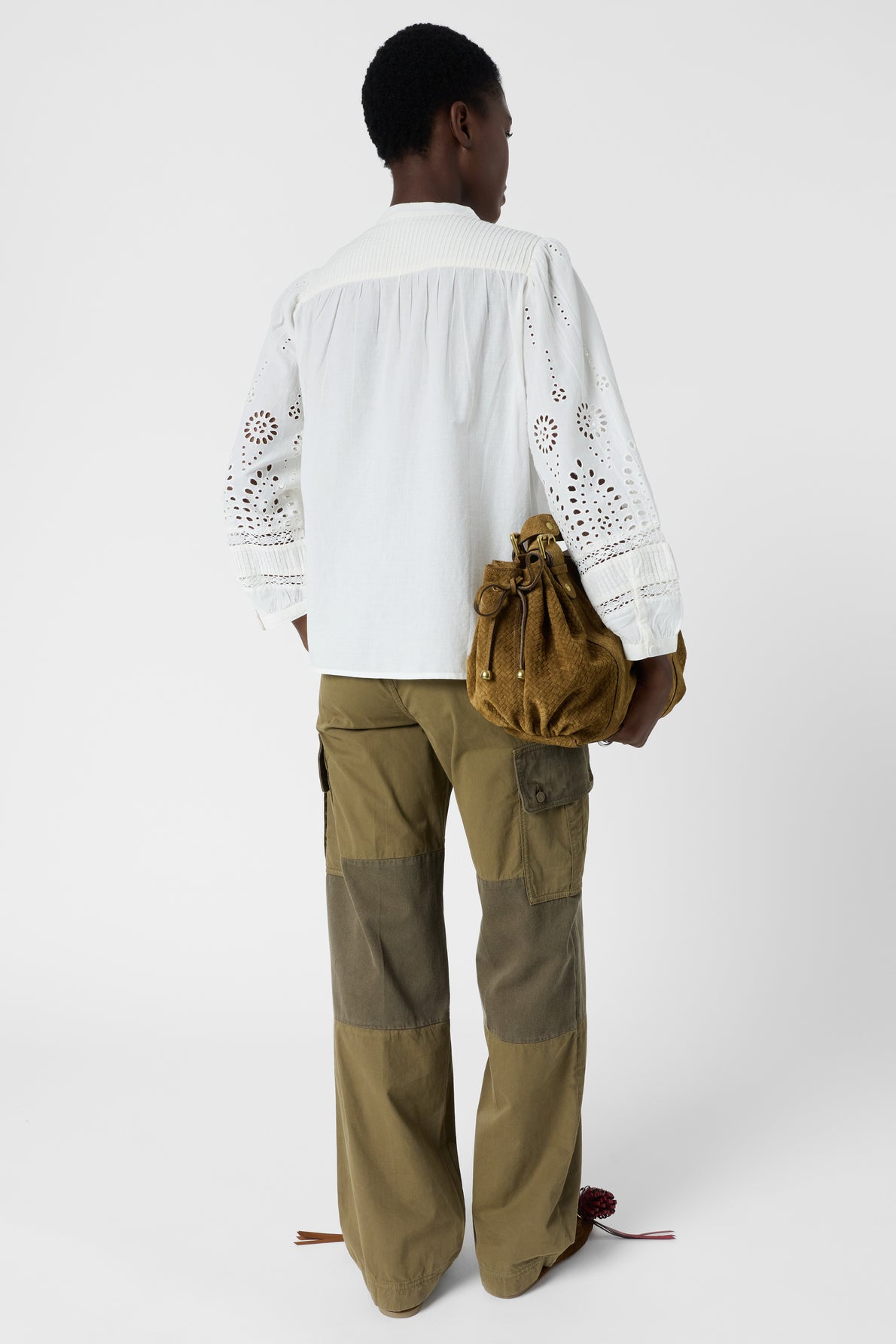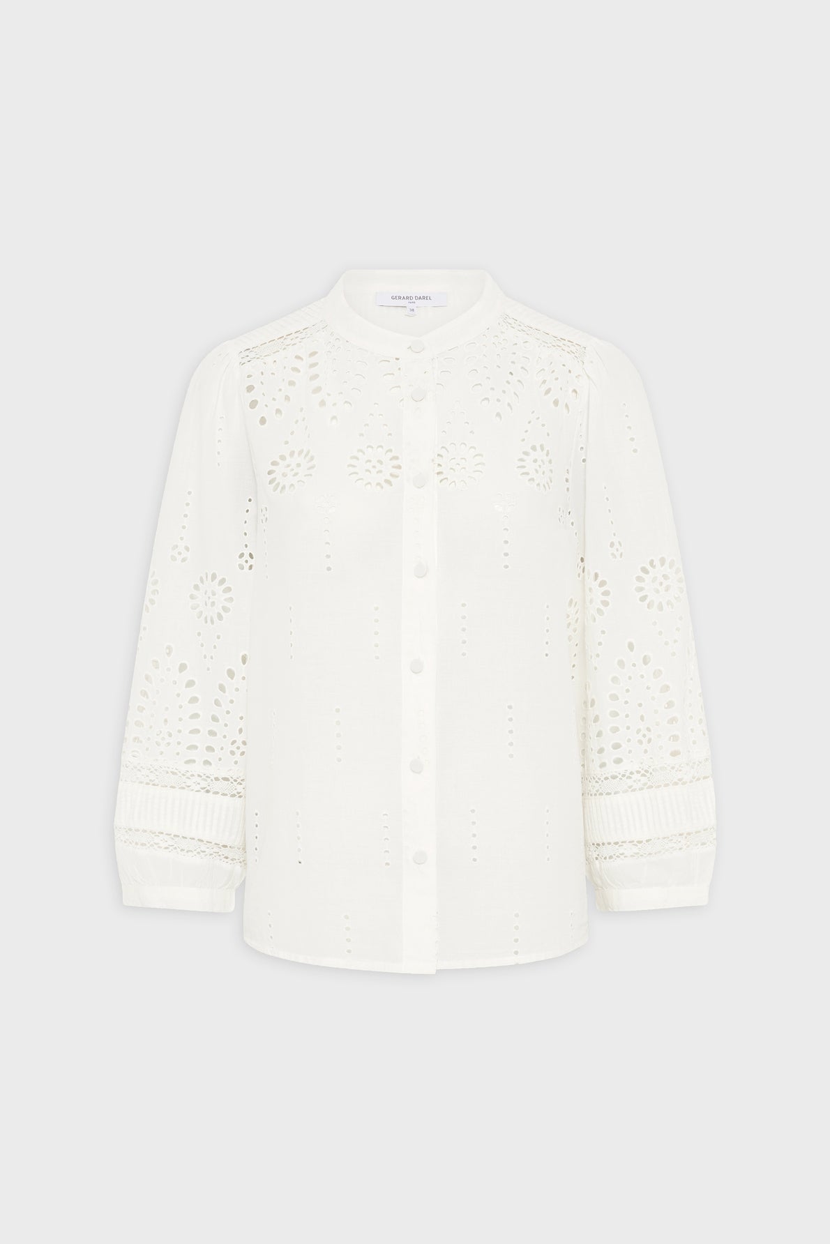 - Design: lightweight blouse with openwork and graphic embroidery for subtle texture