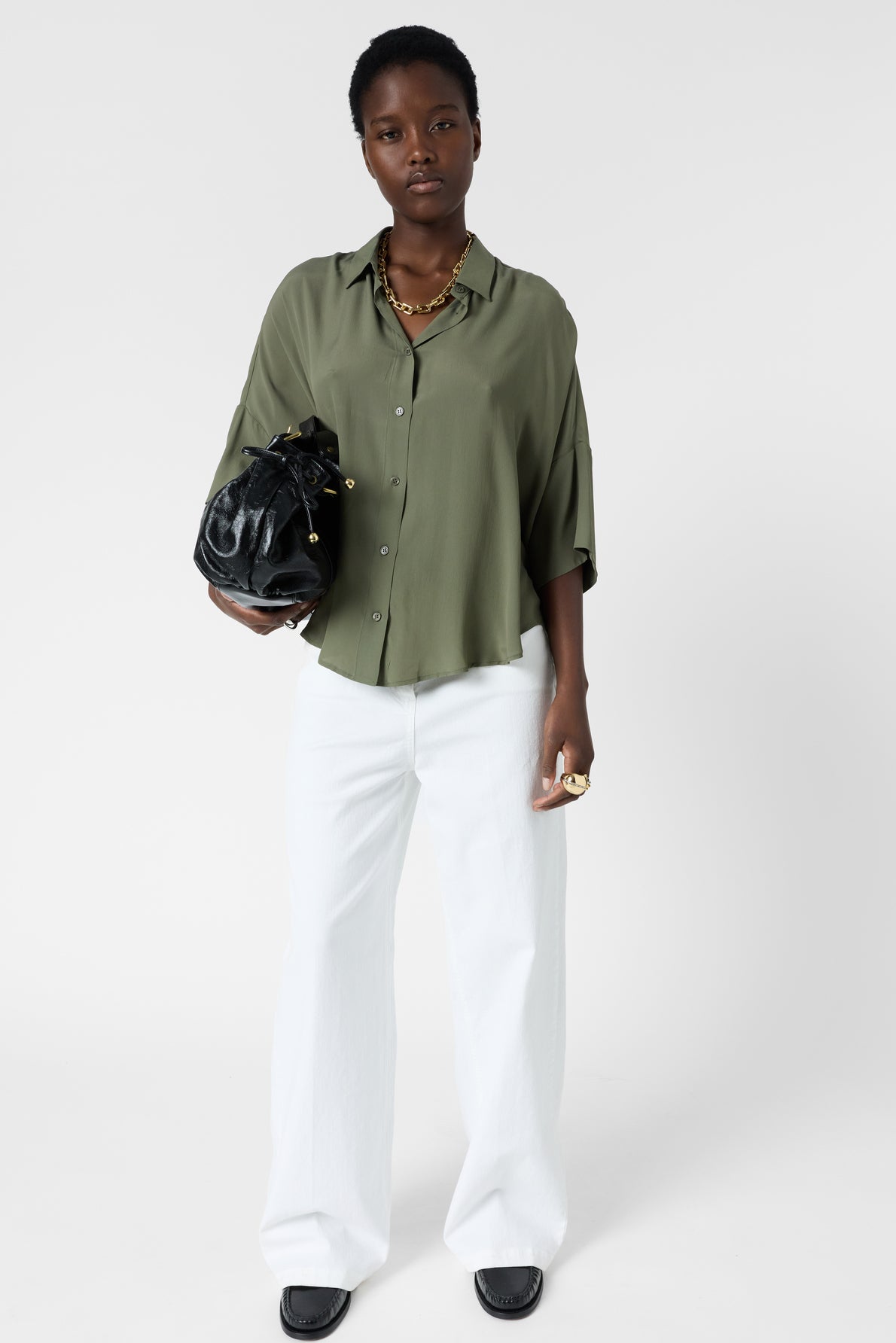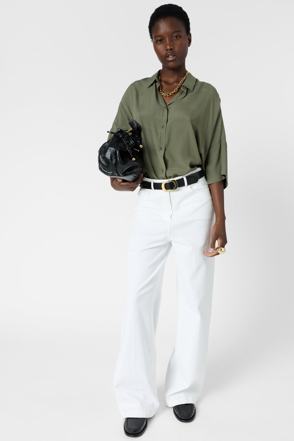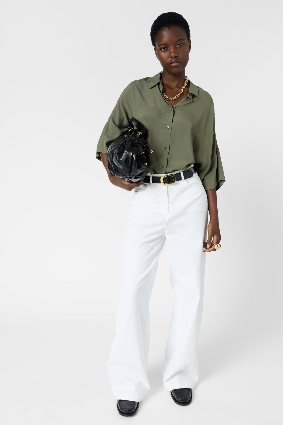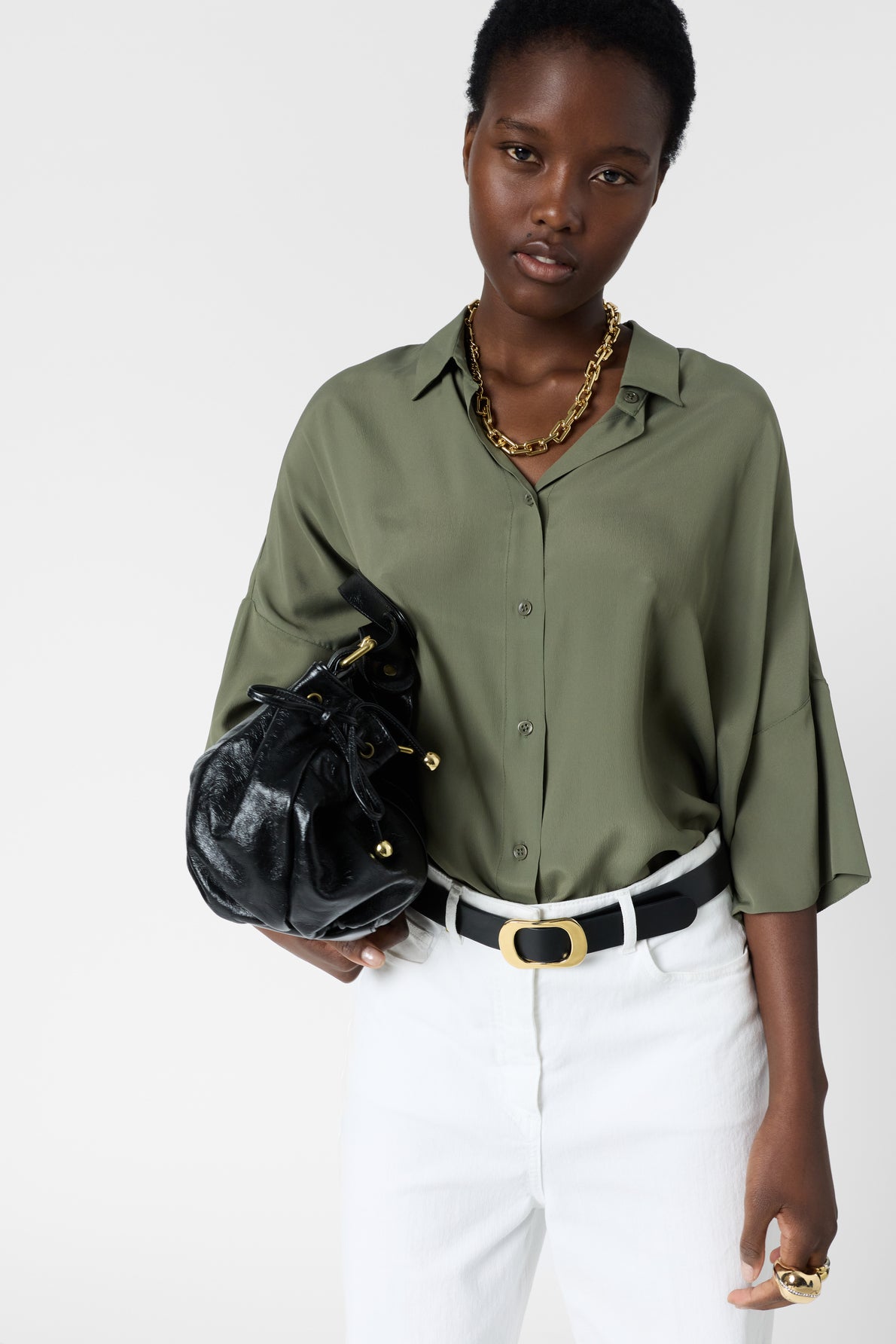 THE CIRAE SHIRT HAS A SLEEK, CONTEMPORARY LOOK AND A FLOWING, OVERSIZED FIT. OFFERED IN A VERY SOFT PINK BEIGE, IT CONTAINS SILK.