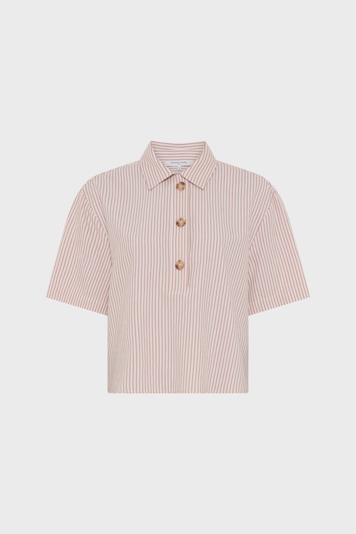 Cazia reinvents the classic shirt with its loose fit, pink stripes, and neckline fastened by three round buttons with a horn-like appearance. Crafted from a light material with a soft touch, it combines style with comfort.