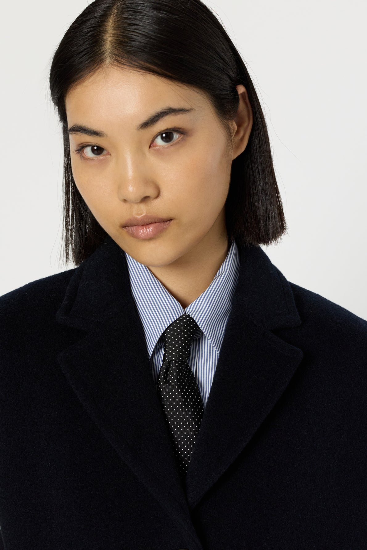 CRAFTED FROM WOOL AND ANGORA, THIS COAT COMBINES STYLE AND COMFORT. IDEAL FOR DEEP WINTER, ITS AMPLE VOLUME ALLOWS FOR WEARING THICK SWEATERS UNDERNEATH. OFFERED IN NAVY BLUE, A TIMELESS COLOR.
