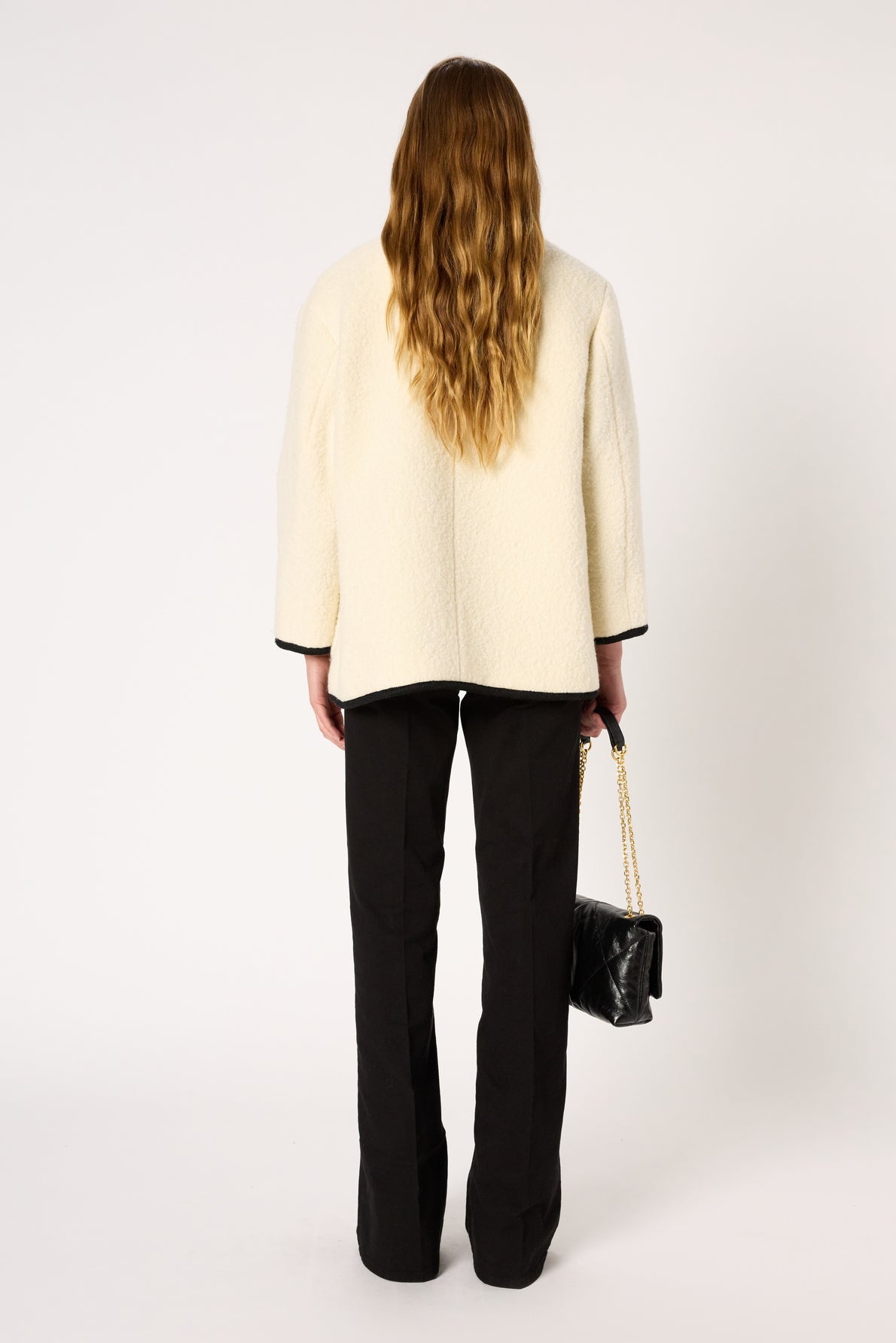 TWO-TONE ECRU AND BLACK JACKET FOR A CHIC COCOON LOOK. MADE OF VIRGIN WOOL WITH A CURLY LOOK.