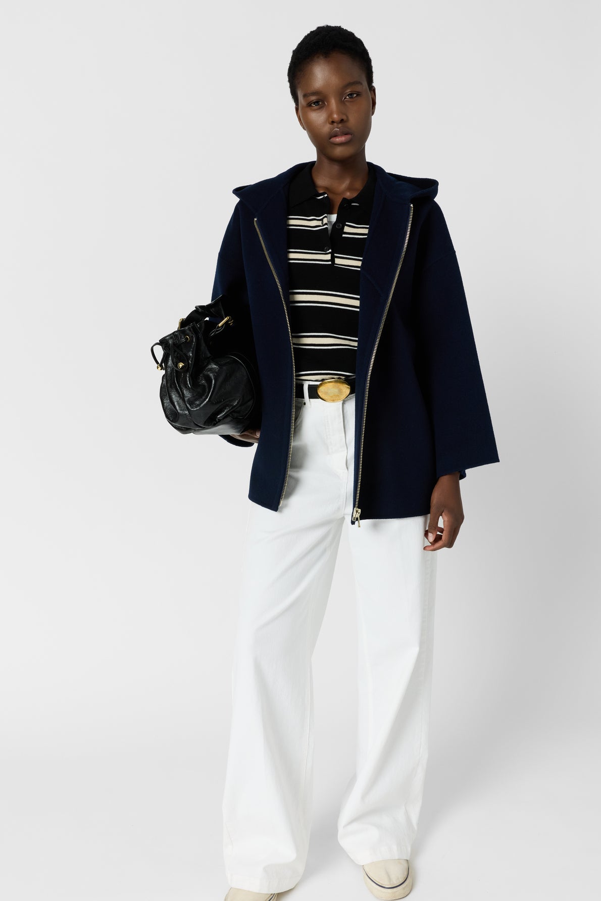LOOSE-FITTING HOODED COAT IN DOUBLE-FACED WOOL, FEATURING SLEEK AND CONTEMPORARY LINES. AVAILABLE IN NAVY BLUE, IT IS IDEAL FOR MID-SEASON.