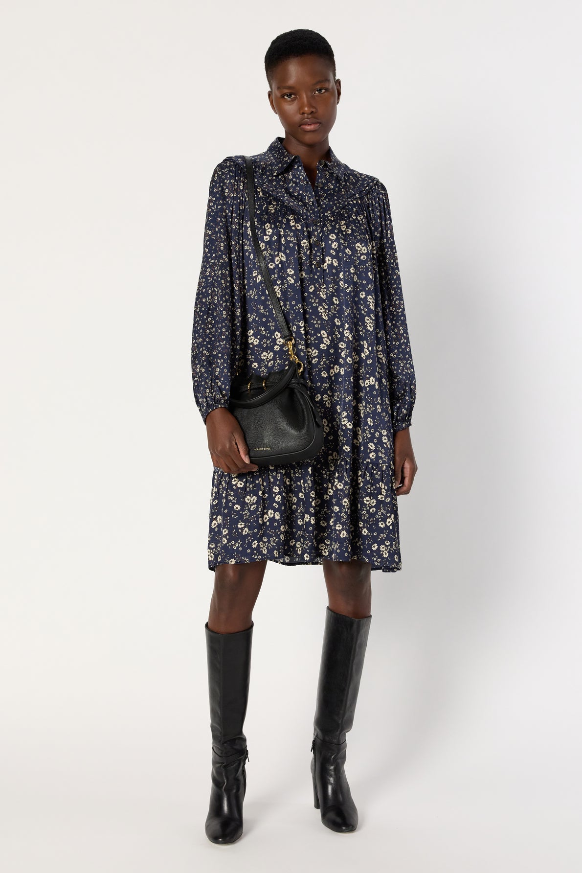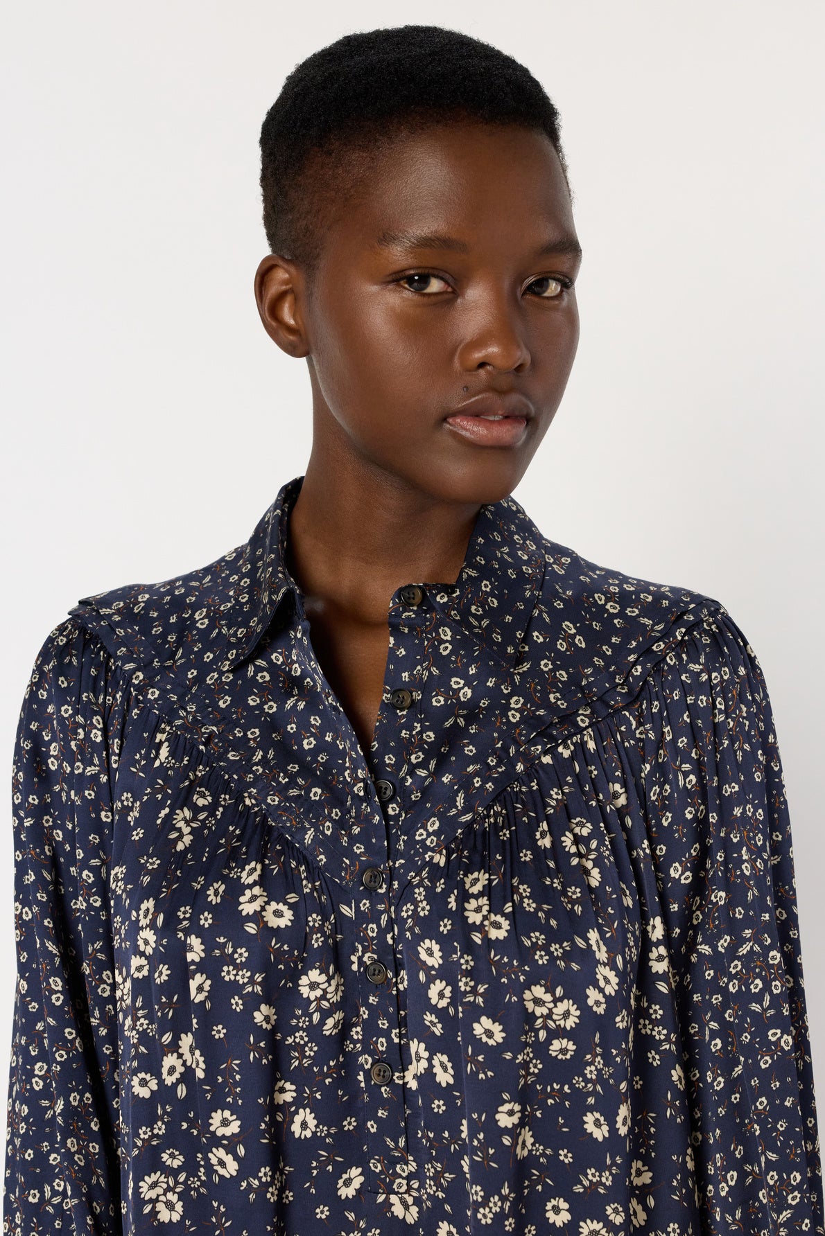 DRESS WITH SHIRT COLLAR MADE FROM A SATINY FABRIC WITH ECRU FLOWERS ON NAVY BLUE BACKGROUND. FLOWING FOR AN AIRY, FEMININE TOUCH.