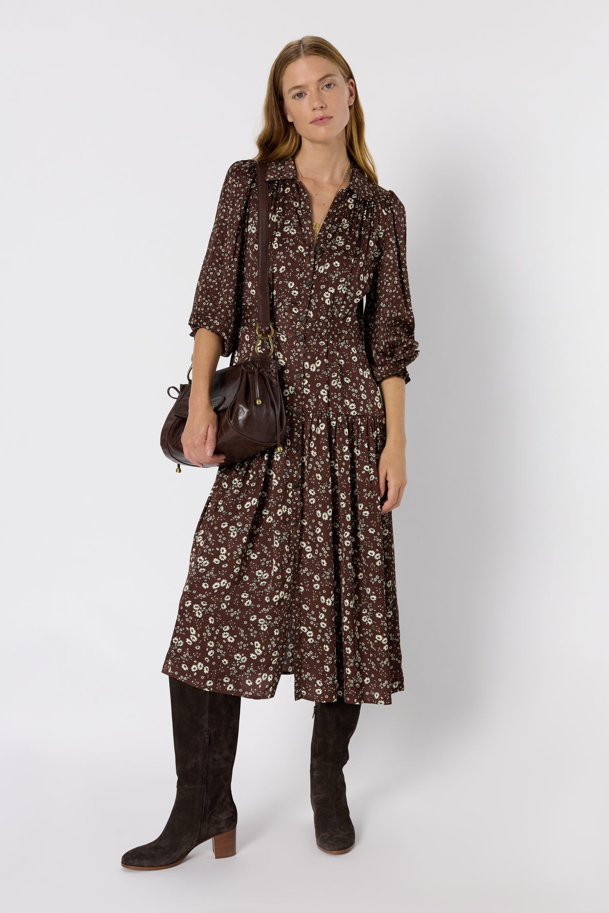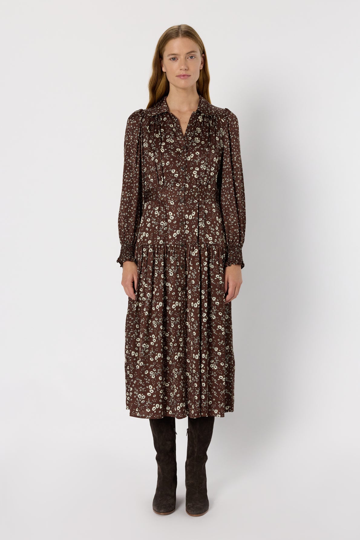 THE LONG SHIRT DRESS LOLITA IS DISTINGUISHED BY ITS CINCHED WAIST, WHICH STRUCTURES THE SILHOUETTE AND LENDS IT FEMININITY. ADORNED WITH FLOWERS, IT IS CRAFTED IN A SOFT-TO-THE-TOUCH SATIN MATERIAL. ITS TIGHTENED AND SMOCKED SLEEVES GIVE IT A SLIGHTLY