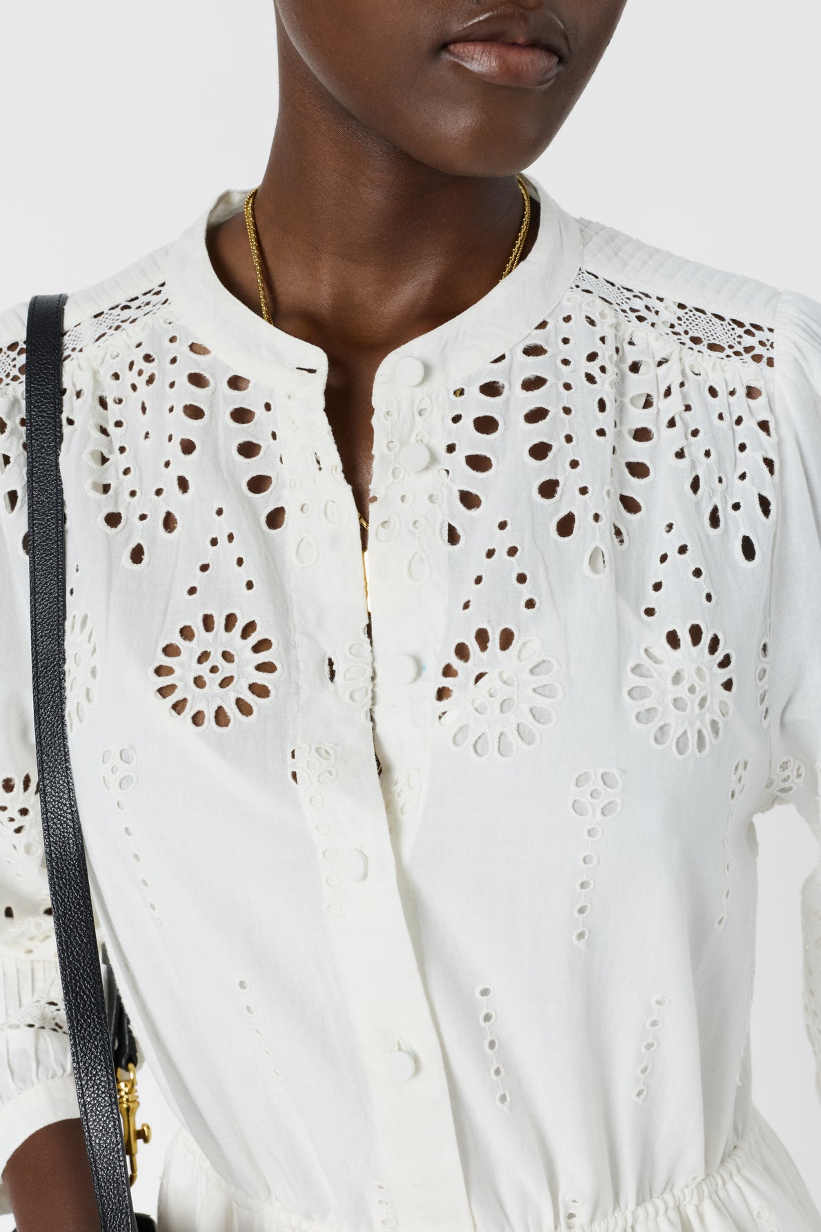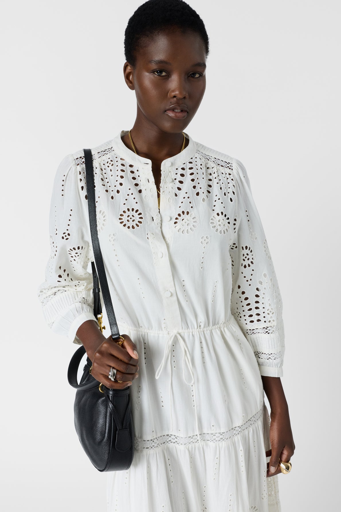 Imagine stepping into a sunlit morning wearing a long dress in ecru, where 100% cotton breathes with you. This dress blends openwork and graphic embroidery on the bodice with a fitted waist and a tiered, pleated skirt that sways with every movement. The round neck and long sleeves with buttoned cuffs offer timeless polish, while the buttoned top lets you adjust the neckline to suit your mood—casual or refined—and pockets tucked into the side seams keep your essentials close at hand.