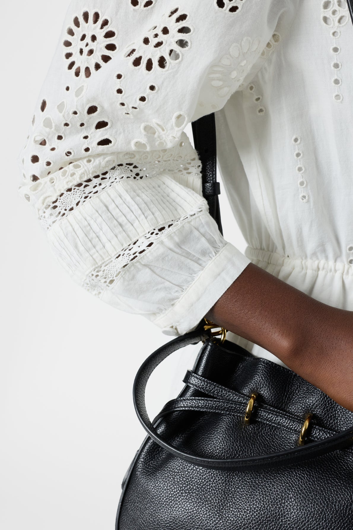 Machine wash cold on gentle cycle with like colors. Use a mild detergent. Do not bleach. Tumble dry low or line dry in shade. Iron on medium heat if needed, focusing on restoring the embroidery and keeping the pleated details crisp. To preserve color and texture, avoid prolonged exposure to direct sun during drying.