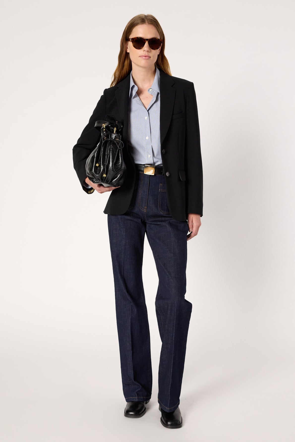 NACIRA JACKET IN BLACK MICROFIBER, A STAPLE OF ANY WINTER WARDROBE. CAN BE WORN AS A SUIT WITH THE MATCHING PANTS OR COMBINED WITH MORE RELAXED PIECES FOR CASUAL CHIC. THAT LITTLE EXTRA: BOUNDED CUFFS WITH GOLD-TONE LUREX, PERFECT WITH ROLLED-UP S