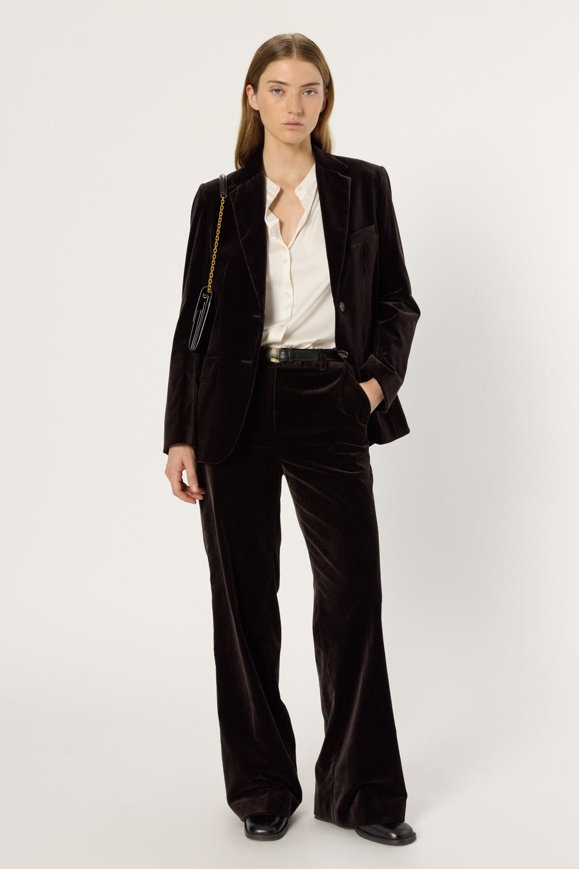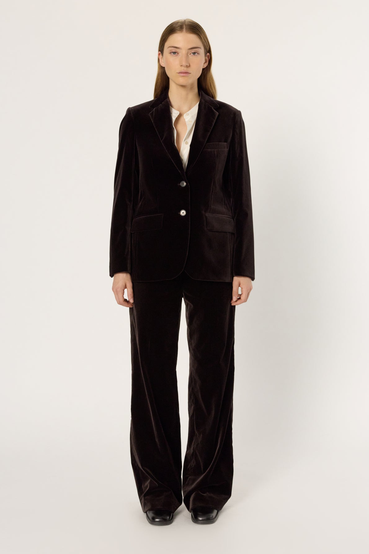 A TAILORED JACKET IN BROWN-BLUE SHORT-PILE VELVET, AN ESSENTIAL AND TIMELESS PIECE. TO BE WORN WITH THE SLEEVELESS VEST AND MATCHING TROUSERS FOR AN ULTRA-CHIC LOOK.