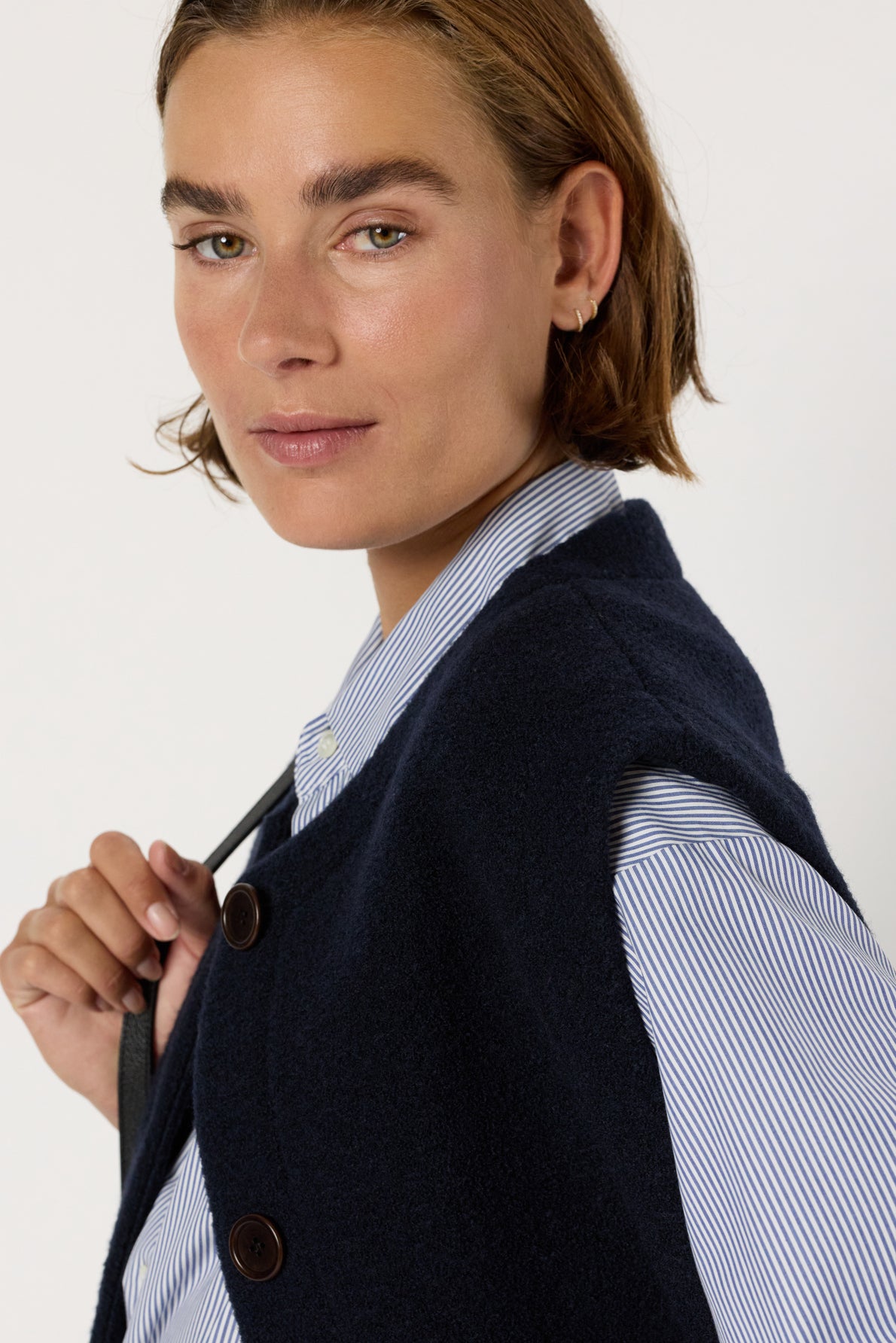 CRAFTED FROM 100% VIRGIN WOOL, THIS BOUCLE SLEEVELESS JACKET COMBINES STYLE WITH COMFORT. AVAILABLE IN NAVY BLUE, IT CAN BE WORN AT THE START OF THE SEASON OVER A SWEATER OR IN THE DEPTHS OF WINTER UNDER A COAT.