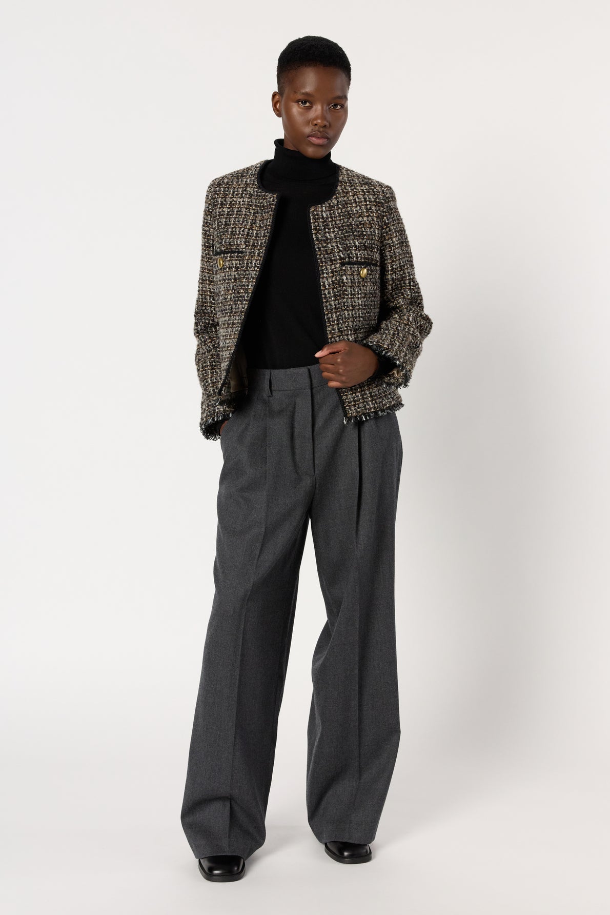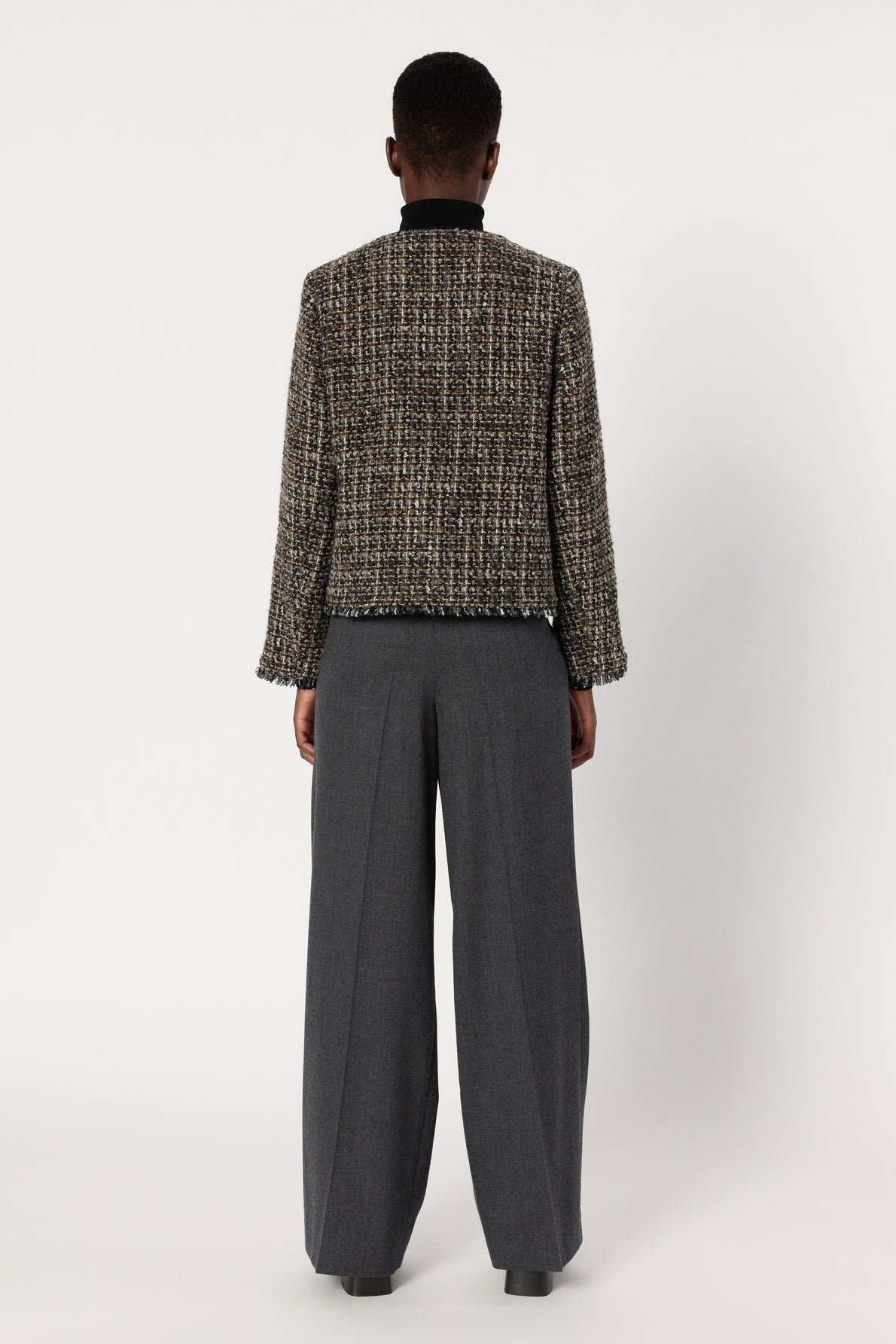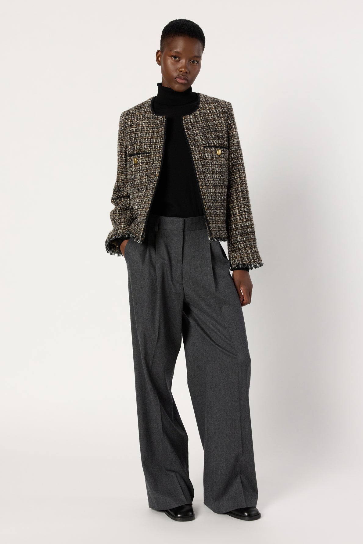 THE TWEED JACKET, A MUST-HAVE FOR EVERY WARDROBE, IS REINVENTED IN MULTICOLOR WITH FRINGED TRIM AND GOLD BUTTONS ON THE POCKETS. WEAR CHIC WITH SUIT PANTS OR SKIRTS, OR ROCK WITH JEANS OR LEATHER PANTS.