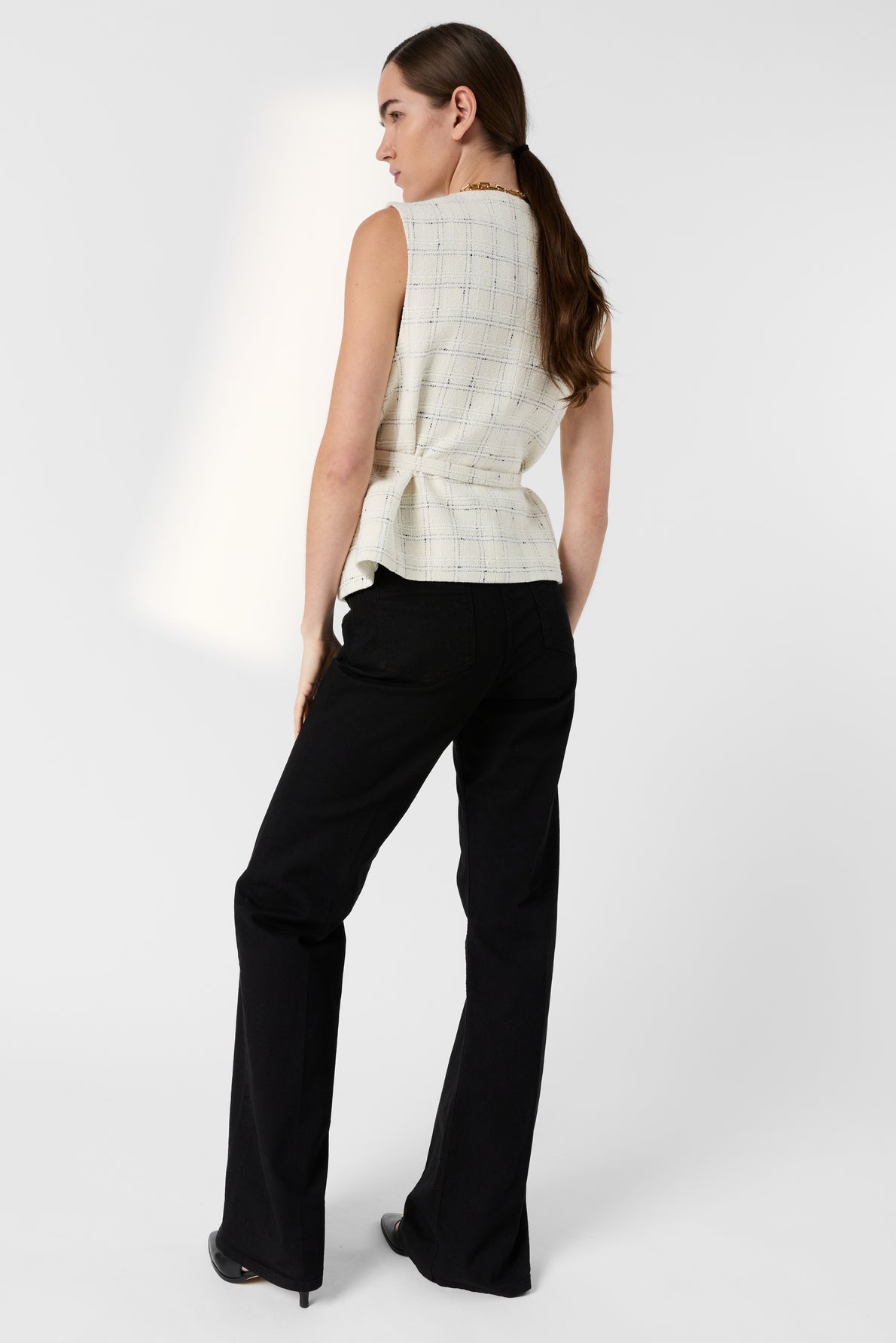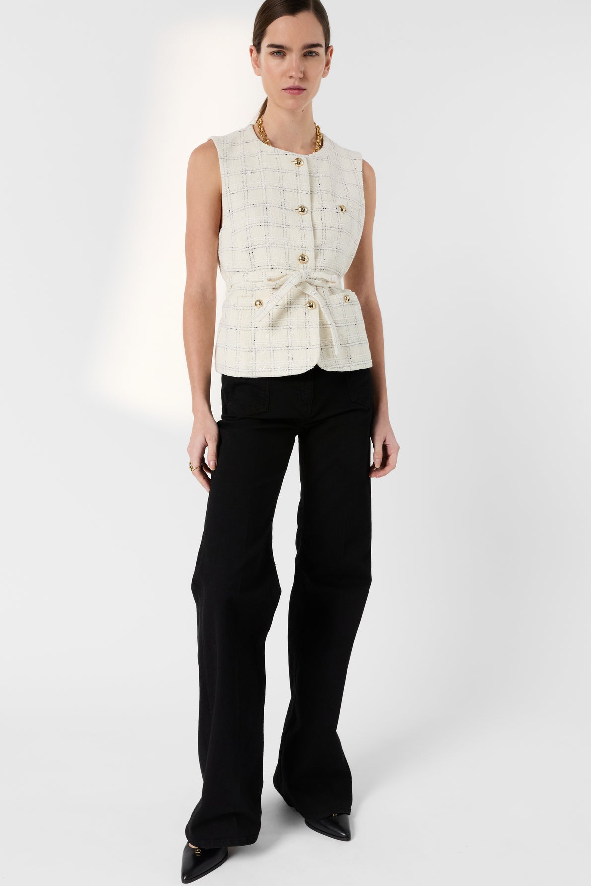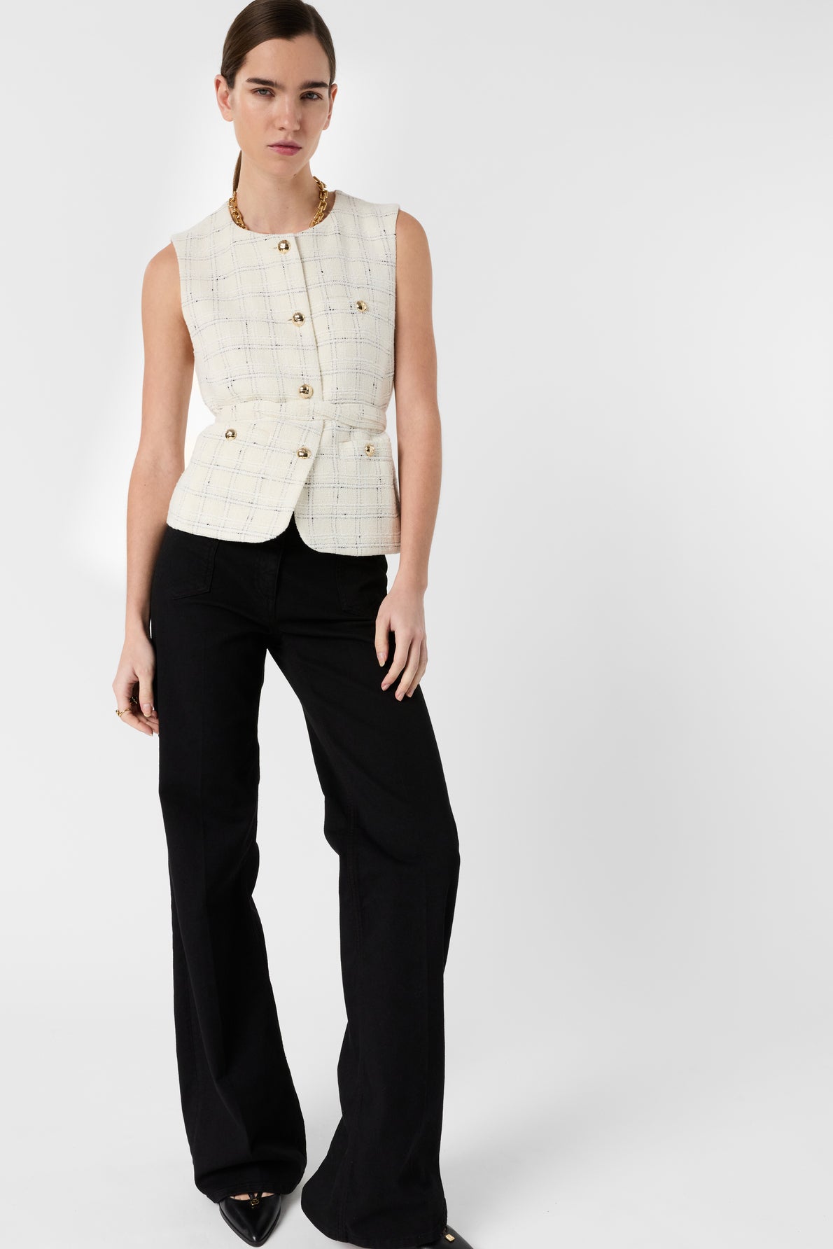 THE TILLIE MODEL IS CONCEIVED AS A STRUCTURED VEST-JACKET: THE ABSENCE OF SLEEVES LENDS IT A MODERN APPEARANCE, WHILE THE STRAIGHT, MID-LENGTH CUT REFINES THE SILHOUETTE. A FINE CHECKERED PATTERN CONTRASTS WITH THE ECRU TWEED AND THE GOLDEN BUTTONS. IT