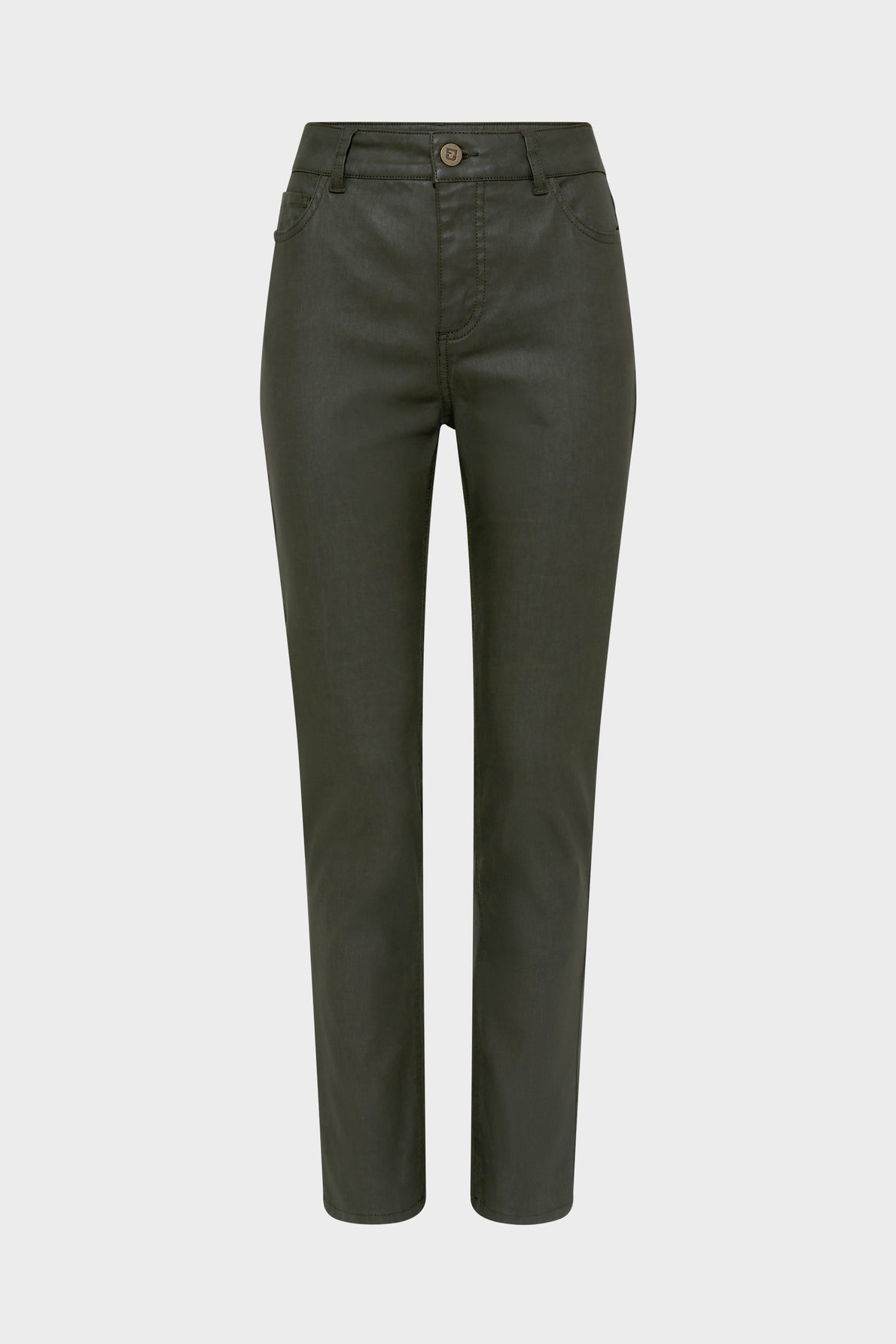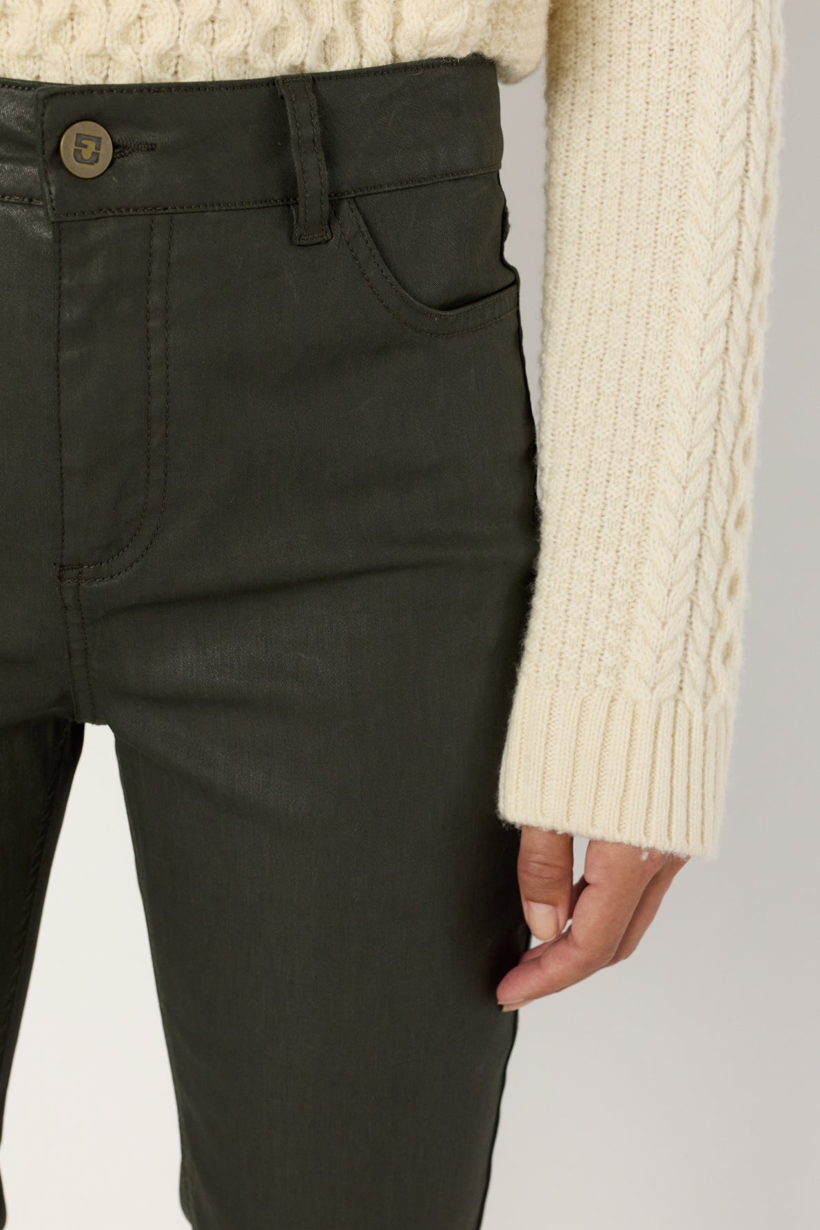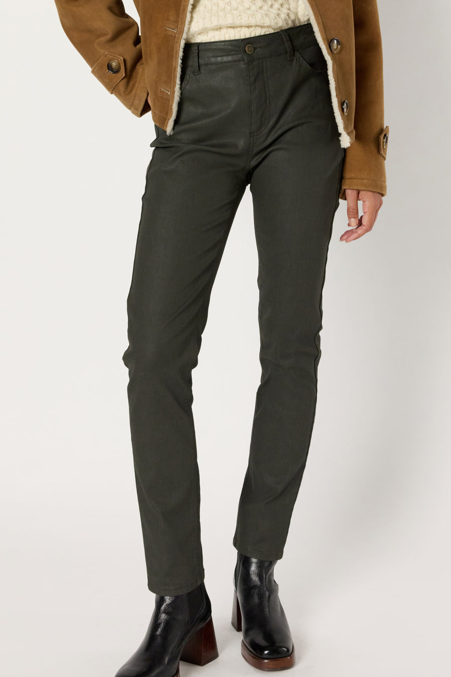 COATED COTTON JEANS DESIGNED TO CREATE A SLIGHTLY SHINY LEATHER EFFECT, AVAILABLE IN KHAKI FOR A STYLISH LOOK.