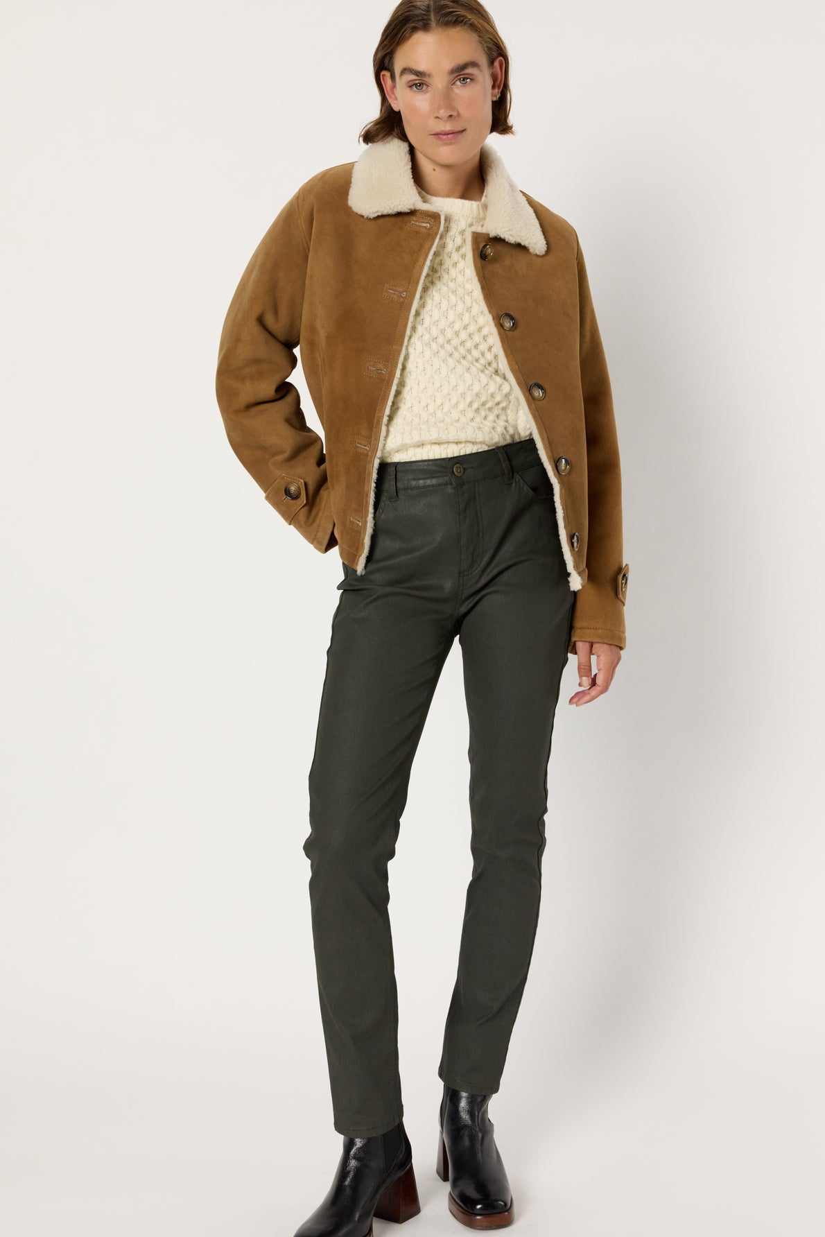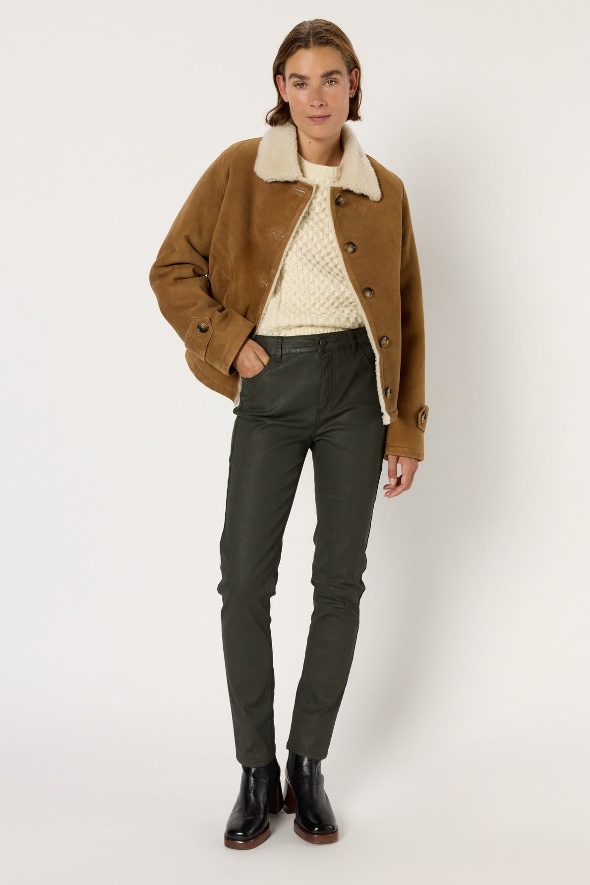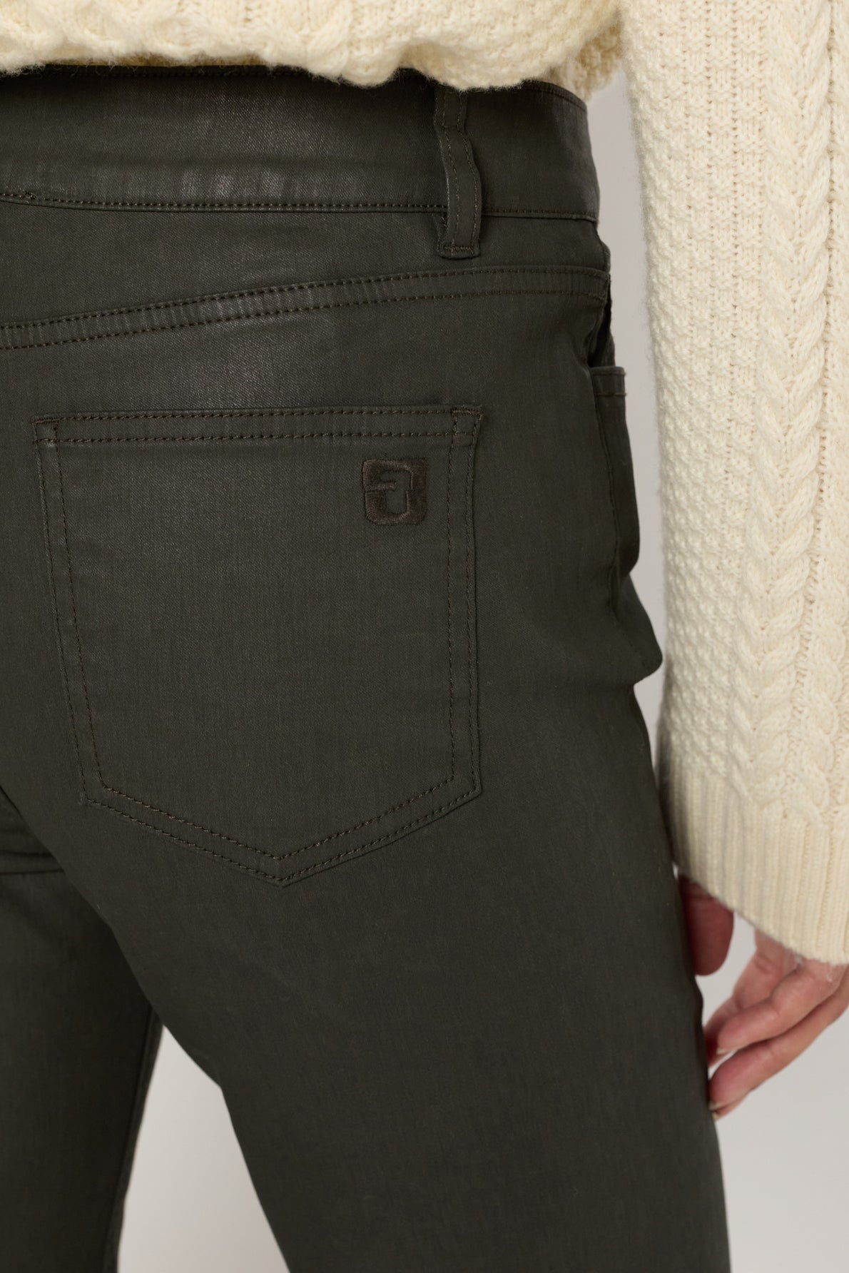 COATED COTTON JEANS DESIGNED TO CREATE A SLIGHTLY SHINY LEATHER EFFECT, AVAILABLE IN KHAKI FOR A STYLISH LOOK.