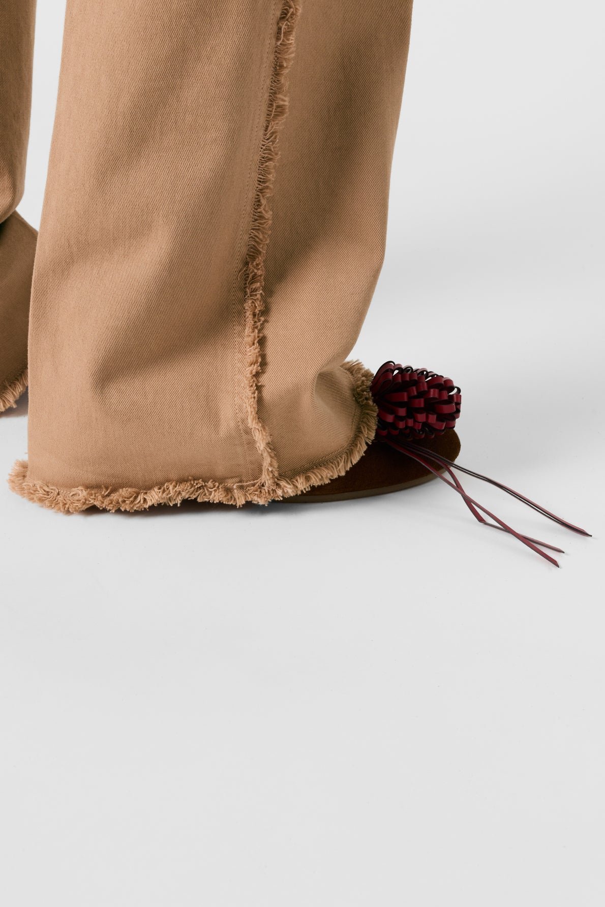 ANNA JEANS, one of Darel's signature pieces, arrive with fringe accents that fuse a rock-inspired edge with everyday polish. In camel, a color that pairs with neutrals and earth tones, these jeans feel instantly versatile. Cut from structured cotton, they hold their shape and drape beautifully, moving with you through the day from morning meetings to evening gatherings. The high waist and flared legs elongate the silhouette, creating a balanced line that feels both confident and effortless.
