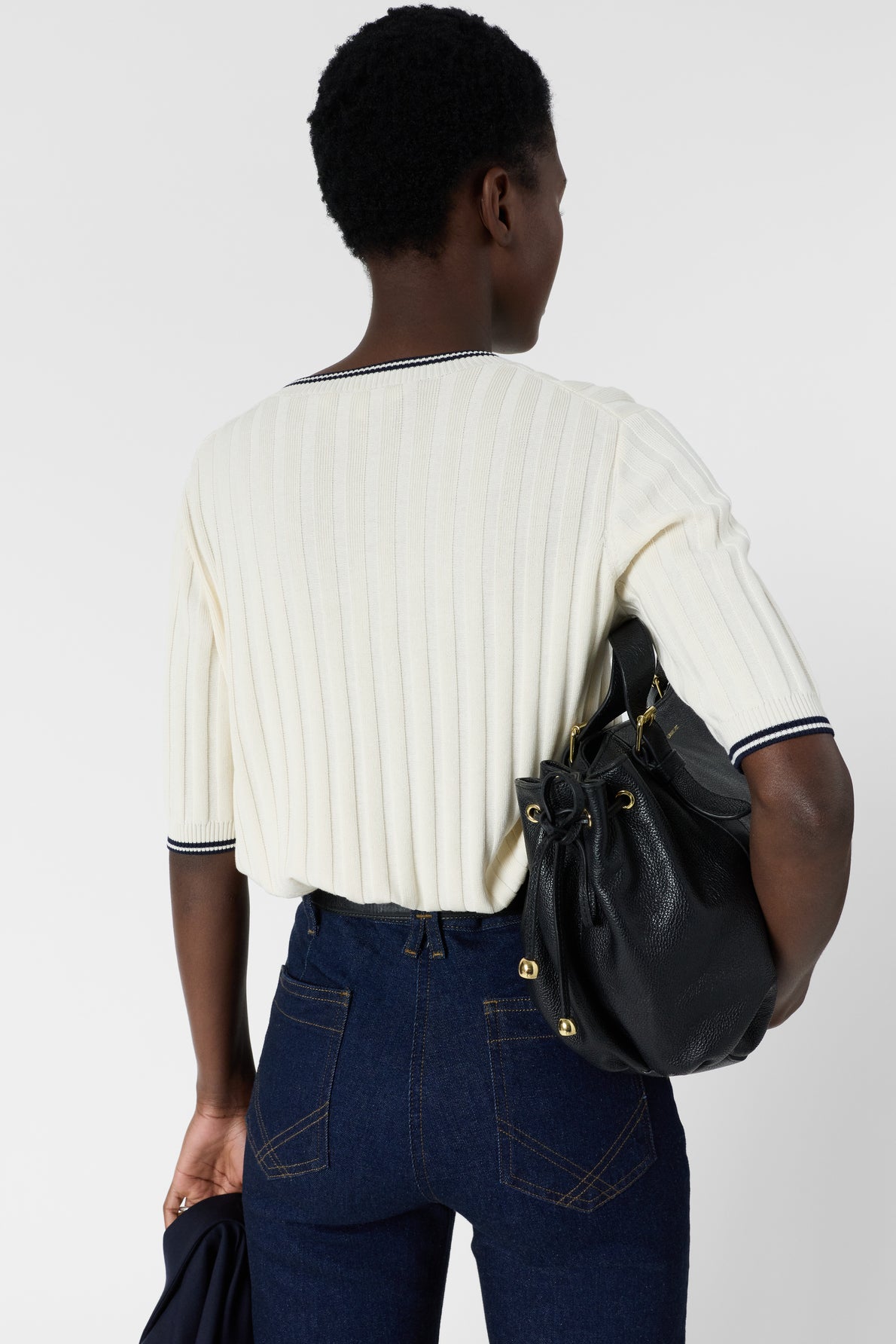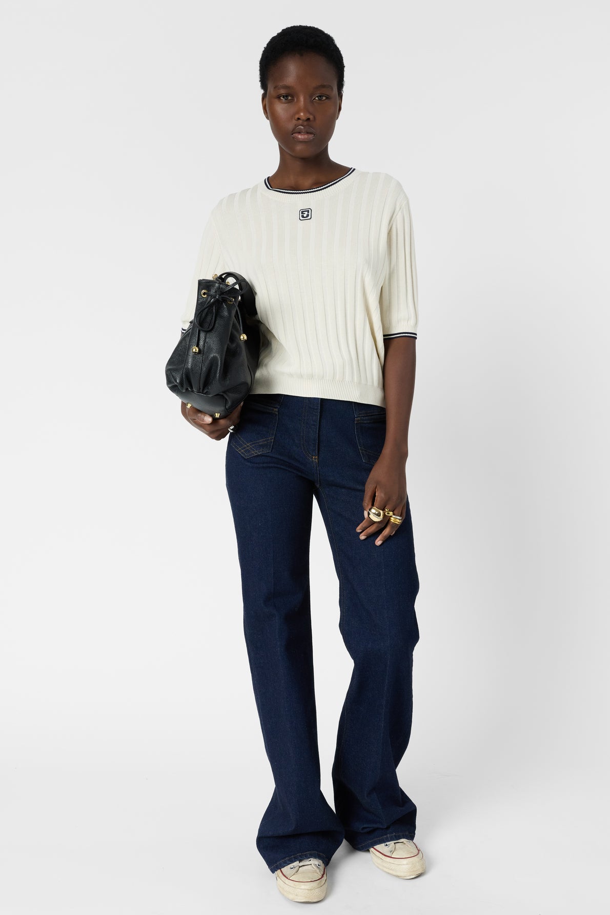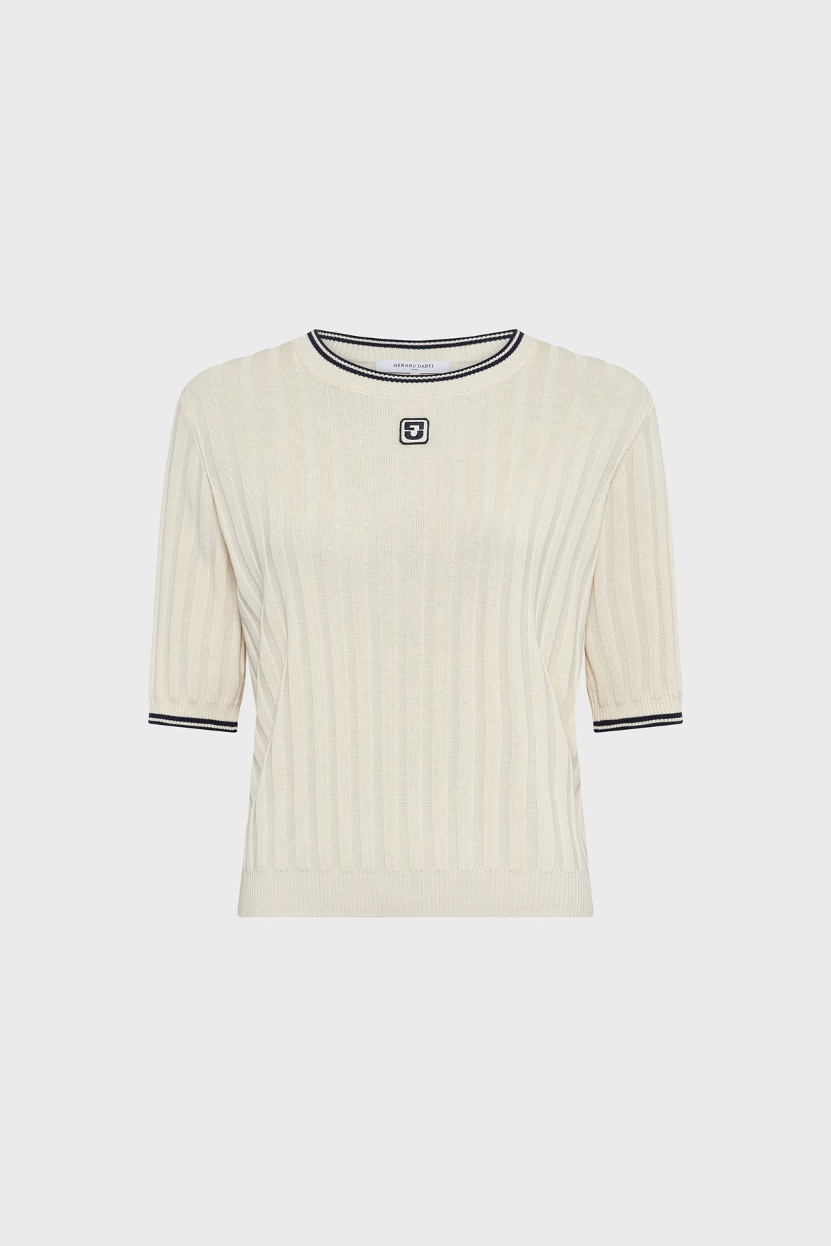THIS SHORT-SLEEVED SWEATER STANDS OUT THANKS TO ITS STRUCTURED RIBBED KNIT, WITH A TEXTURED EFFECT CREATED BY ALTERNATING KNIT AND PURL STITCHES. ITS ECRU COLOR IS ENHANCED BY CONTRASTING DETAILS ON THE COLLAR AND SLEEVES FOR A SPORTY-CHIC LOOK. IT IS