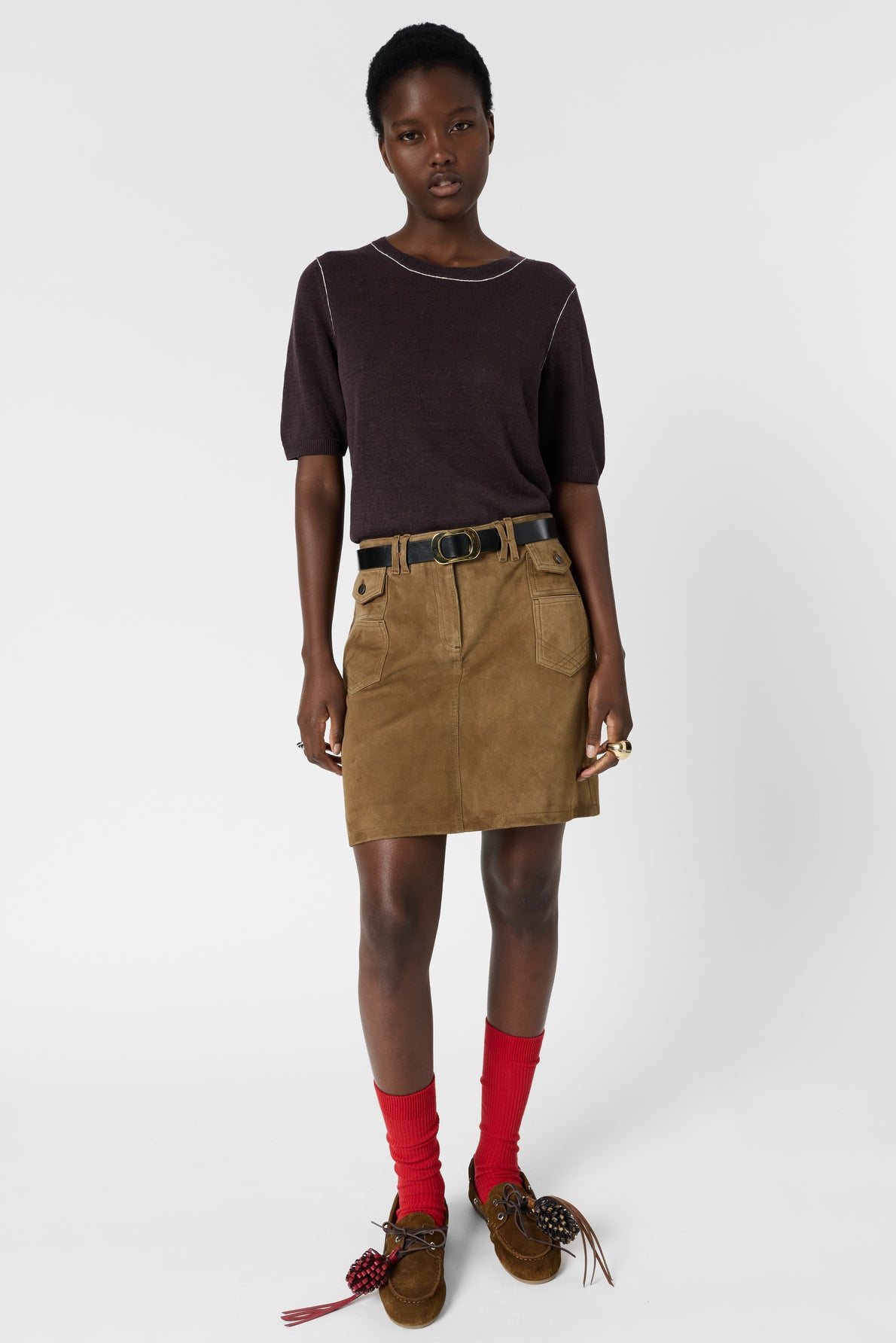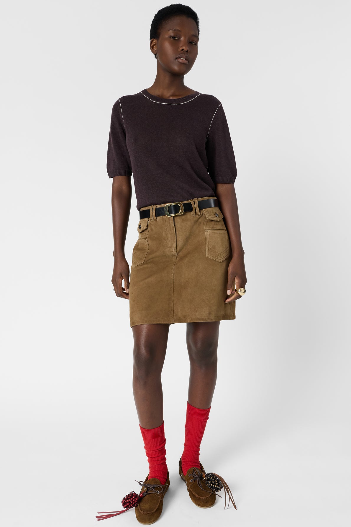 The piece is designed to pair beautifully with white, ecru, and camel tones, creating a cohesive, elevated wardrobe—whether you’re layering under a lightweight blazer or wearing it on its own with your favorite denim. This brown staple anchors outfits with timeless appeal and a soft, breathable texture that adapts to changing climates and occasions.