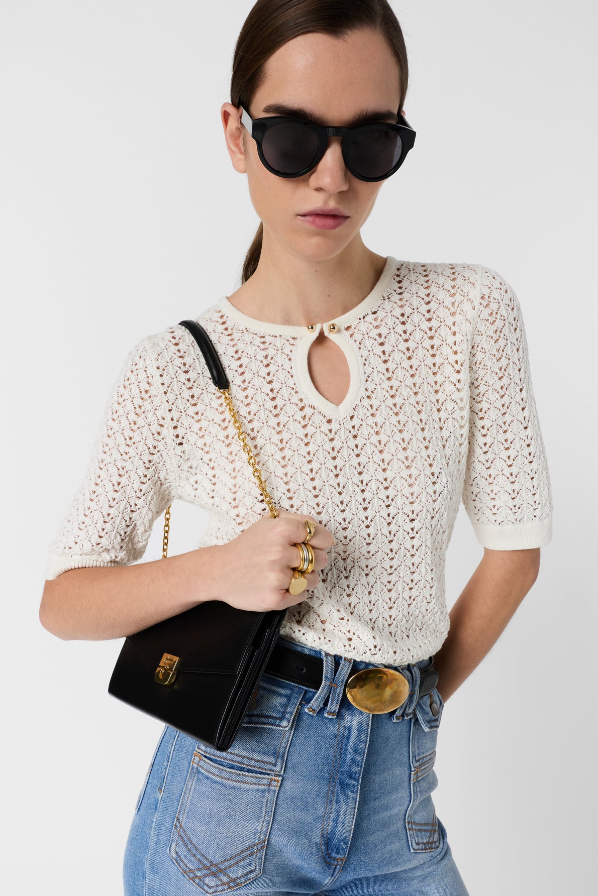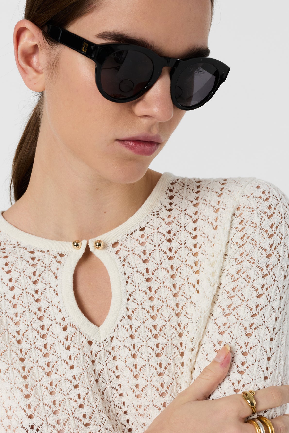 RETRO CHIC SPIRIT FOR THIS WHITE CROCHET SWEATER WITH A TEAR DROP NECKLINE ADORNED WITH TWO DECORATIVE GOLDEN BUTTONS. IT IS CRAFTED FROM A BLEND OF COTTON AND LINEN.