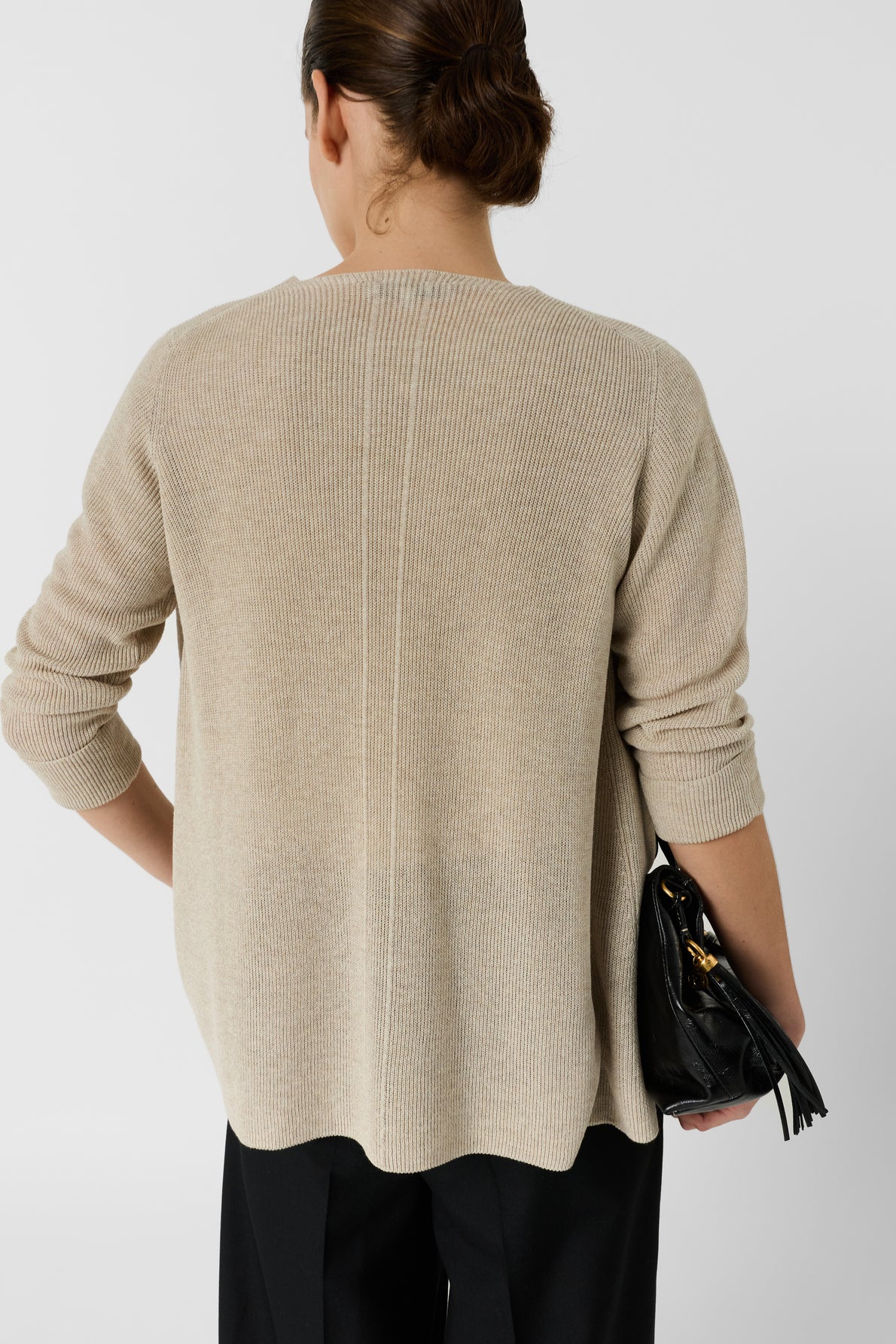 CRAFTED IN SUBTLY IRIDESCENT BEIGE KNIT, THE LORINA CARDIGAN MAY BE WORN OPEN OR WITH A BELT. IT WILL CAPTIVATE WITH ITS FLUID AND FEMININE DRAPE. PAIRED WITH THE MATCHING SWEATER, IT WILL COMPOSE A LOVELY MID-SEASON TWIN SET.