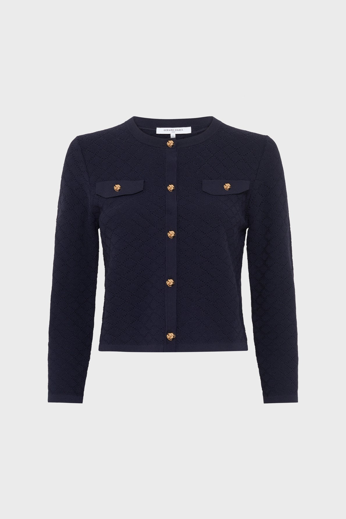 NAVY CARDIGAN CRAFTED IN AN OPENWORK KNIT, FEATURING A SUBTLE DIAMOND PATTERN FOR A REFINED TEXTURE. THE STRAIGHT CUT IS ENHANCED BY FLAP POCKETS ADORNED WITH GOLDEN BUTTONS, OFFERING AN ELEGANT TOUCH. A CHIC PIECE THAT IS EASY TO PAIR.