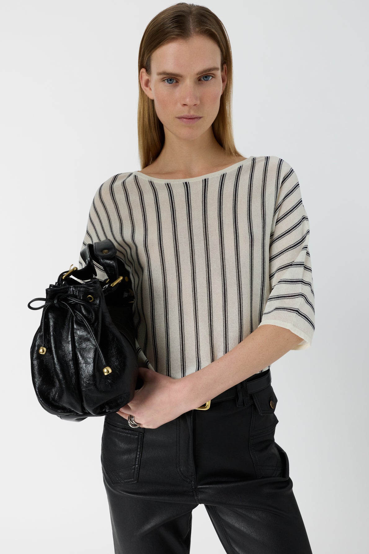 Machine wash cold on a gentle cycle with like colors. Use a mild detergent. Lay flat to dry to preserve the drape and the delicate transparency effect. If needed, lightly steam to refresh the open neckline and vertical stripe pattern; avoid wringing and high heat.