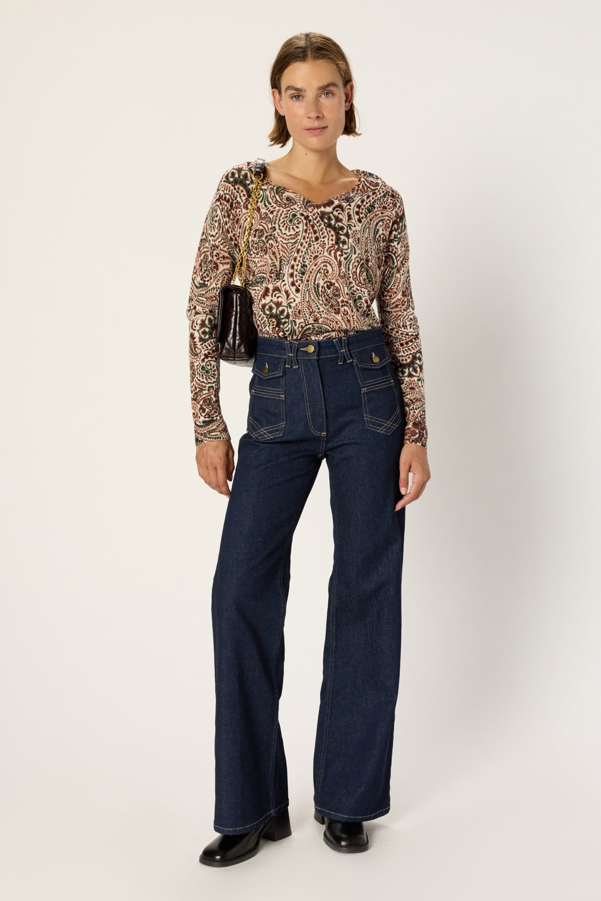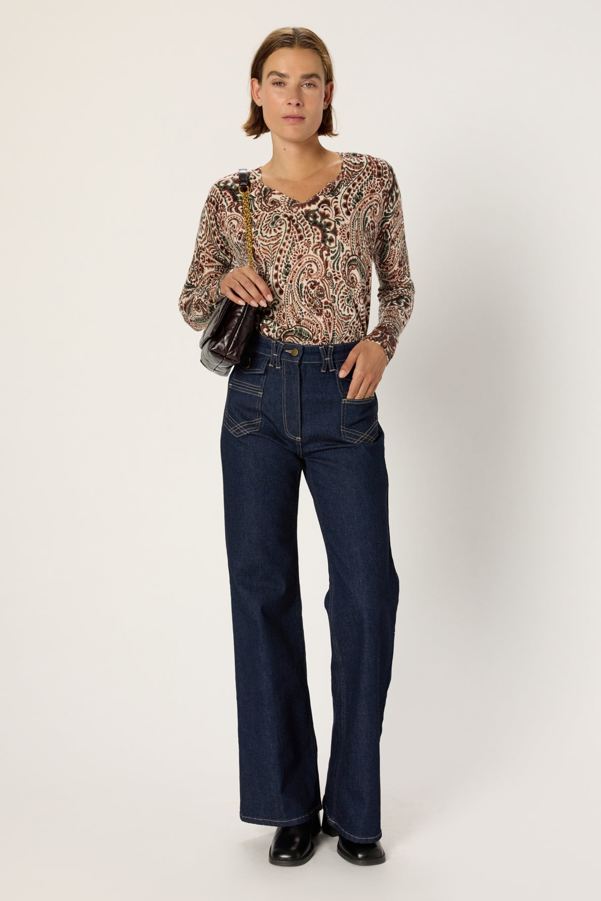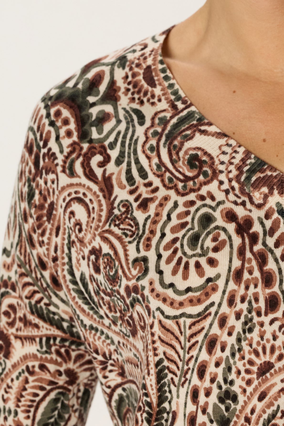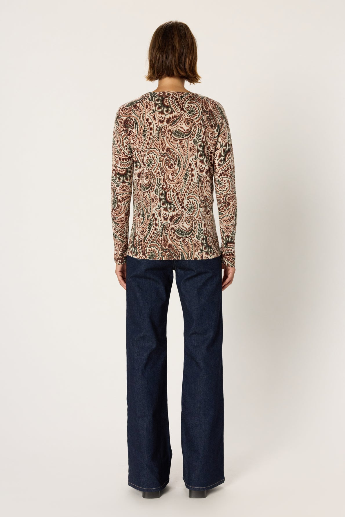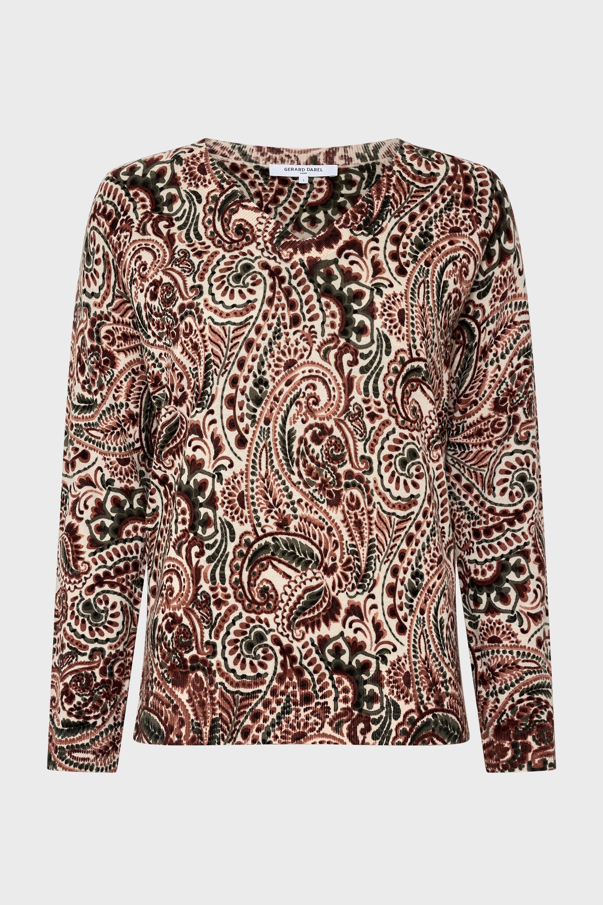 CRAFTED FROM FINE MERINO WOOL AND ADORNED WITH BURGUNDY PRINTS, THIS SWEATER WILL ADD A TOUCH OF CHIC WHIMSY TO OUTFITS.