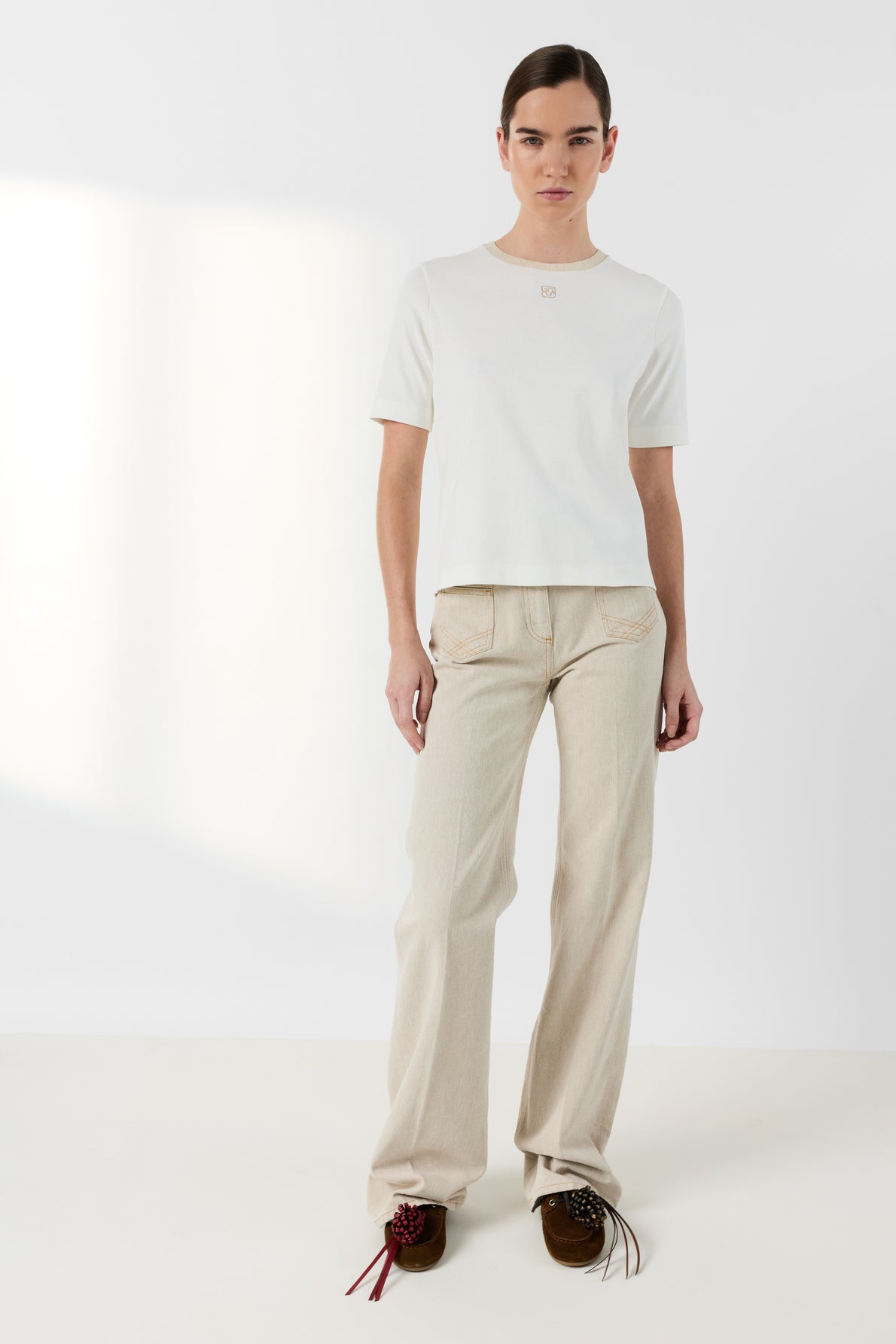 CRAFTED FROM COTTON WITH STRUCTURE, AND FEATURING A RIBBED COLLAR, THE MAVIE T-SHIRT IS INSPIRED BY THE SWEATSHIRT. OFFERED IN WHITE, IT IS ADORNED WITH A GOLD EMBROIDERED MONOGRAM AND A GOLD COLLAR.