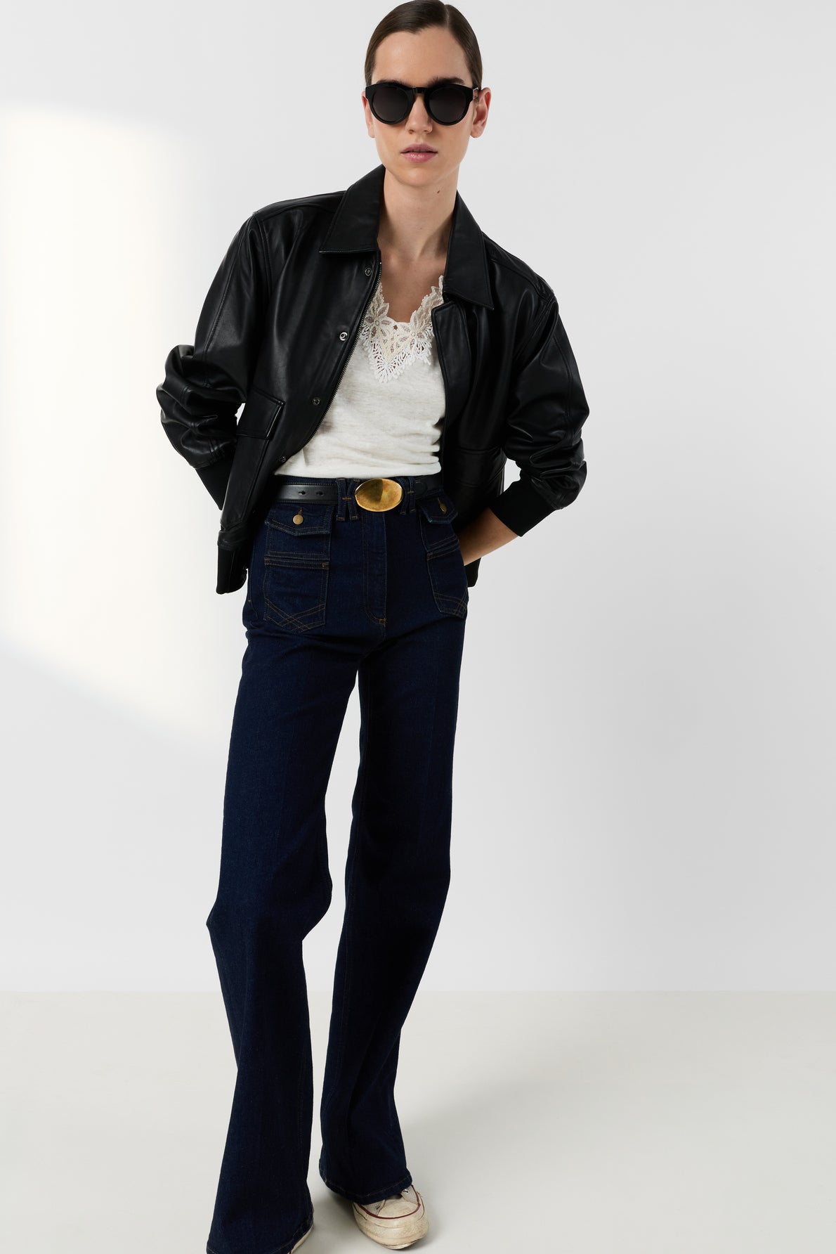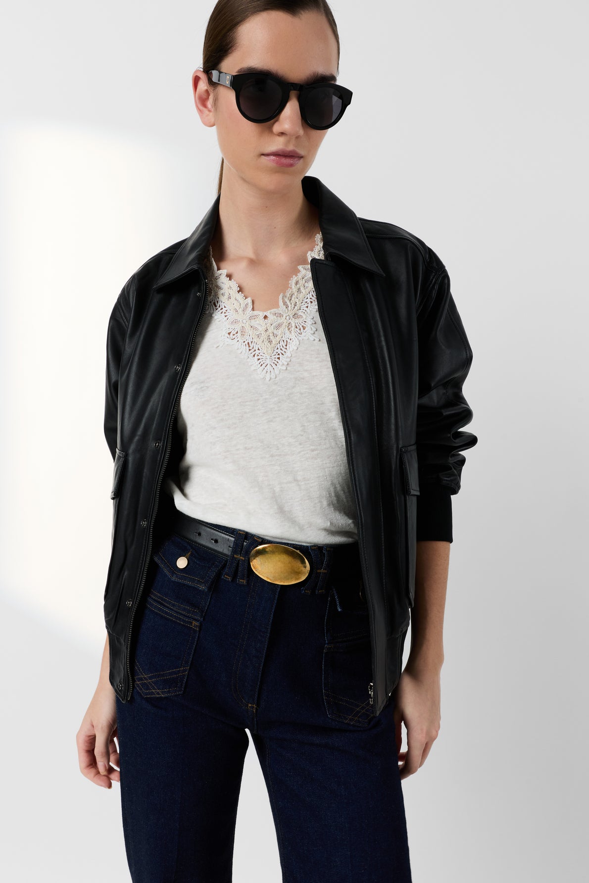 CRAFTED FROM 100% LINEN, THIS BLACK T-SHIRT IS ADORNED WITH EMBROIDERY AT THE NECKLINE, LENDING IT A TOUCH OF ELEGANCE.