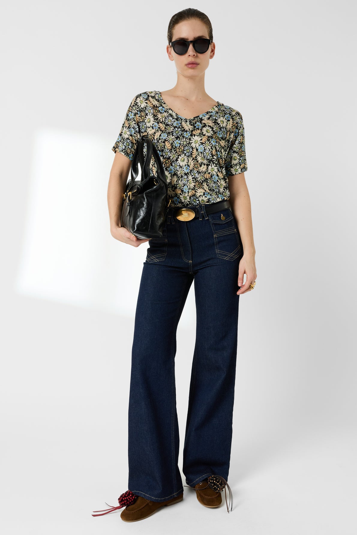 ADORNED WITH A FLORAL PATTERN ON A NAVY BLUE BACKGROUND, FEATURING A FLUID CUT AND A V NECKLINE, THE MALINAE T-SHIRT EMBODIES CASUAL FEMININITY. IT IS CRAFTED FROM A COTTON BLEND.