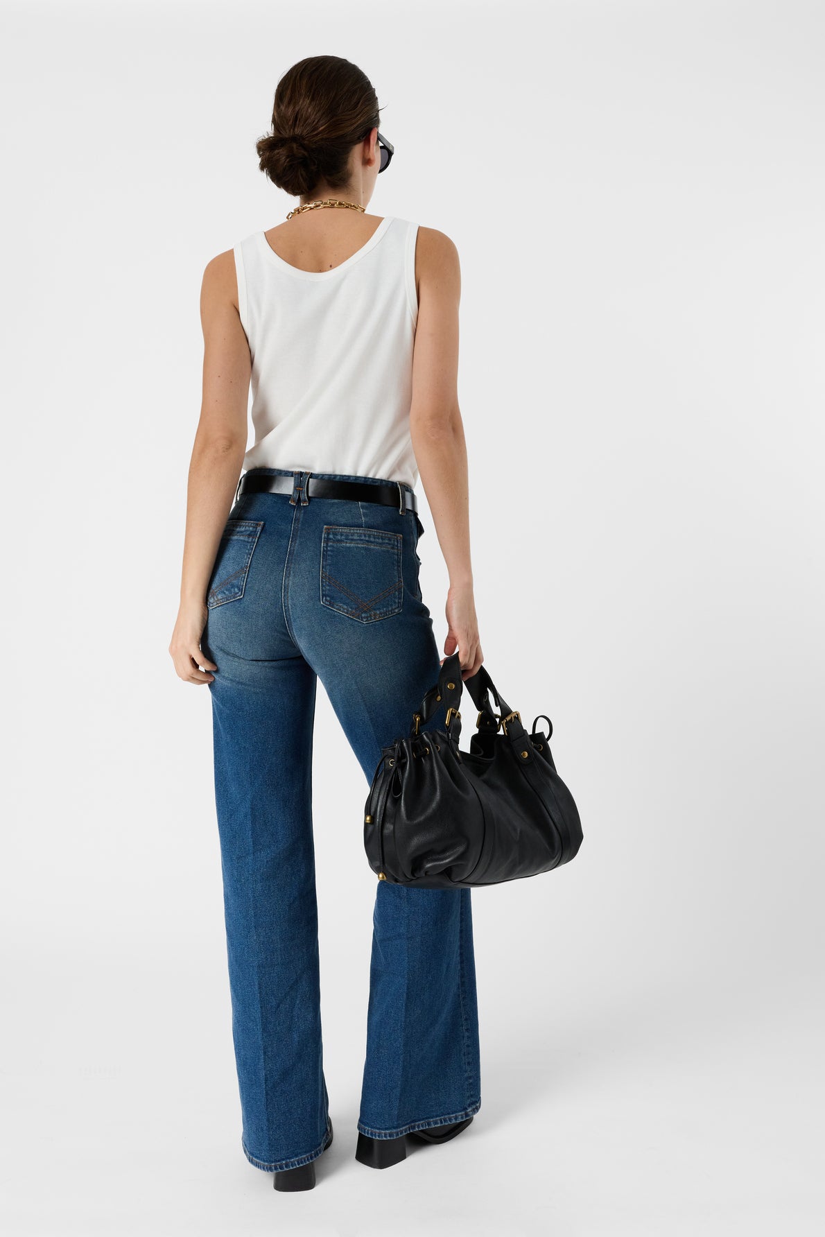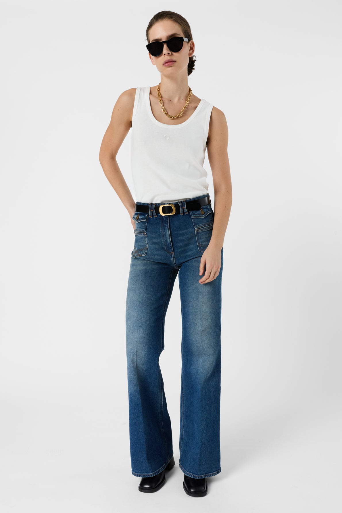 The tank is cut in a straight silhouette for a clean, versatile drape. It is designed to layer smoothly under jackets, cardigans, or denim for a casual yet polished look. For the best fit, choose your usual size; if you prefer a looser drape, consider sizing up, and if you prefer a closer fit, sizing down. Please refer to the size chart for exact measurements.