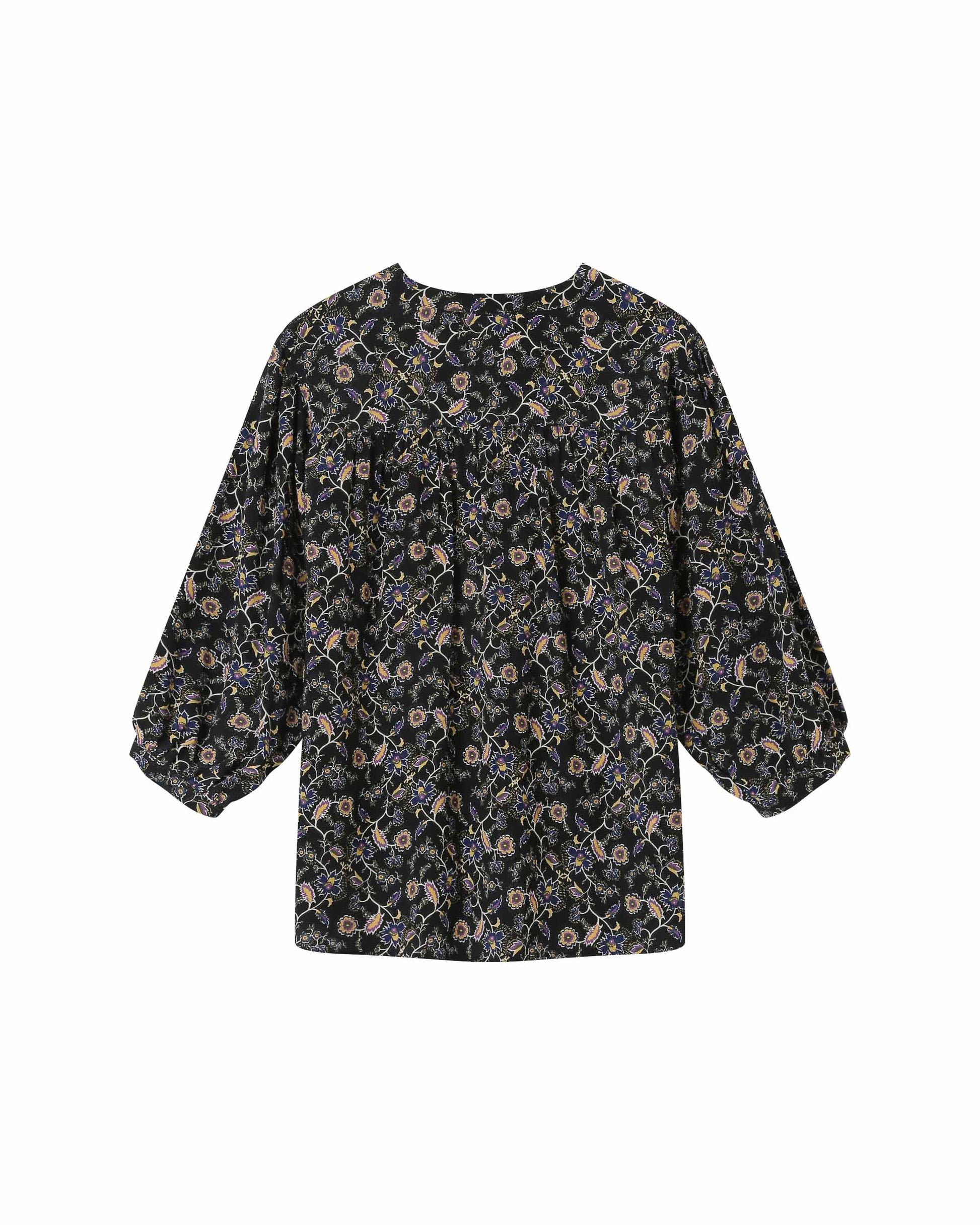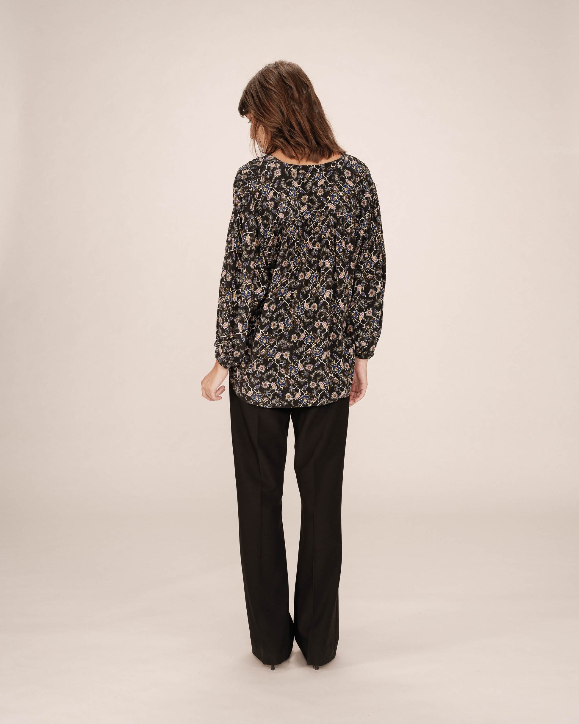 The Secrete printed blouse is a light and relaxed piece that draws a feminine and refined look.Sublimated by a print with floral patterns, the blouse presents a V -neck and frowstones on the shoulders and in the back, which make it a room with timeless elegance.The secret patterned blouse has a buttoned opening on the front.
