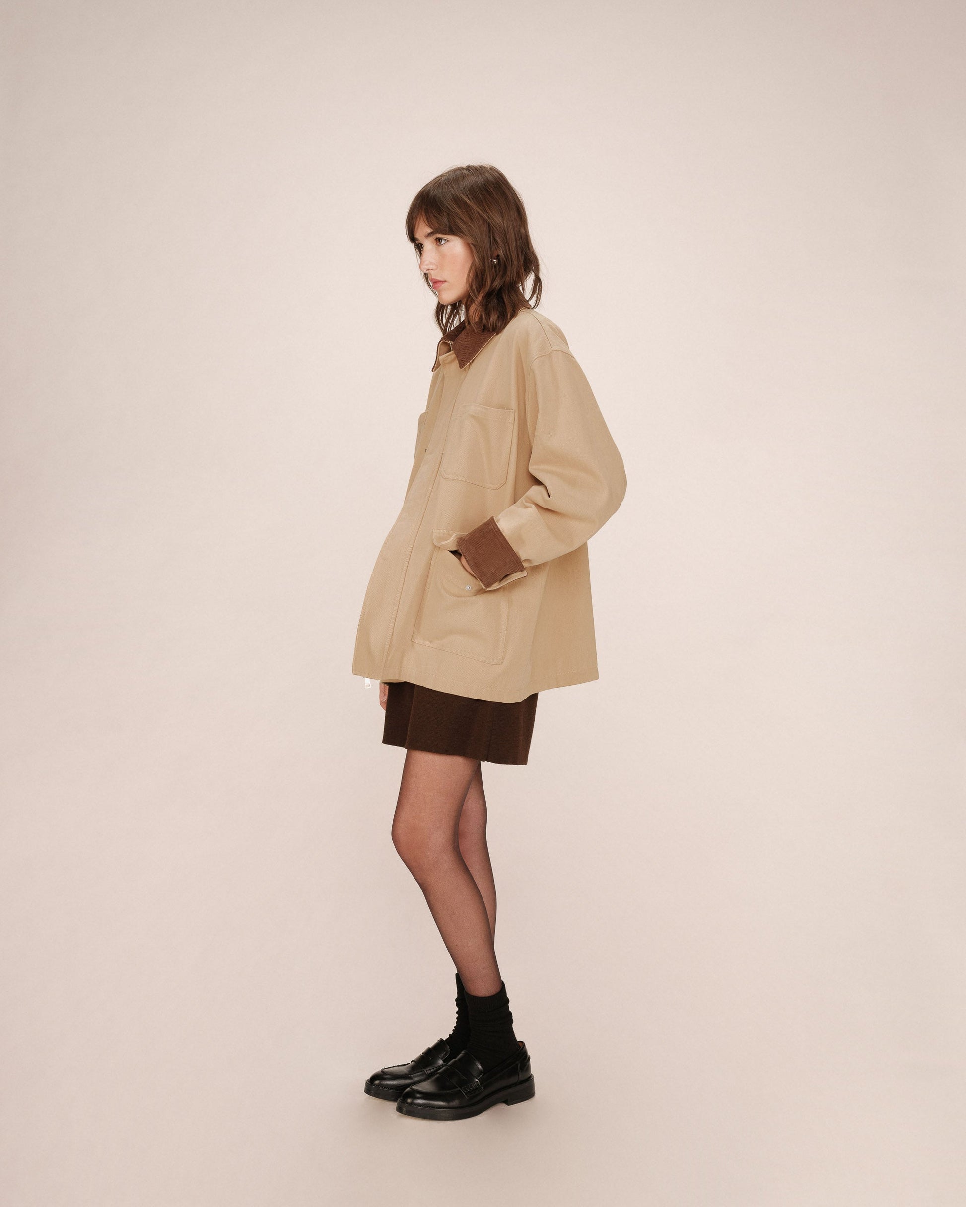 Borrowed from the military cloakroom, the Soraya utility jacket is a functional and trendy room.The neutral shades, the structured cut and the neat finishes make the Soraya long sleeve jacket a worked and modern room.The model has a classic shirt collar, a zipper hidden on the front and a ribbed velvet neck.This part is made of 100% cotton.