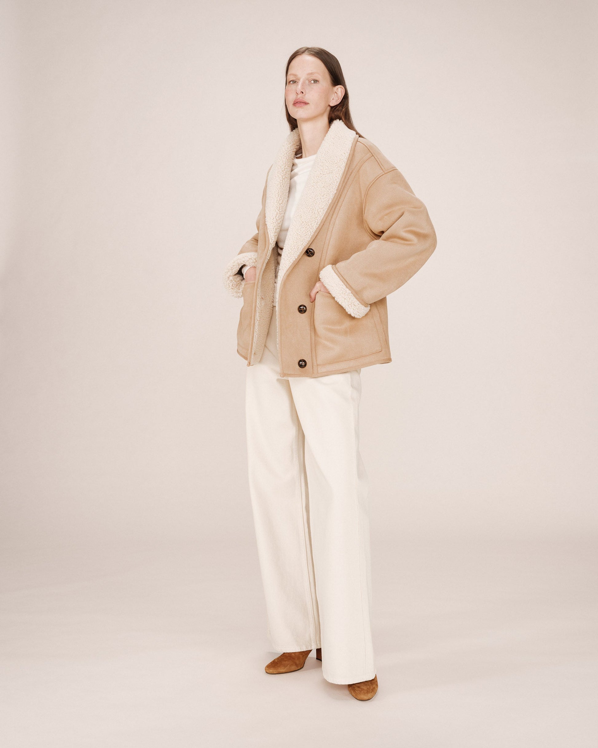 Indispensable part of the season, the Oversize Swan coat is made of 0 shearling inside and 0 suede outside, which gives it a soft and warm touch.The model has a simple buttoning, packed pockets on the front and contrasting buttons.The oversize cup of the mantle in Shearling Swan associates with a shawl collar and cuts underlined by stitched finishes to draw a modern and sophisticated look.