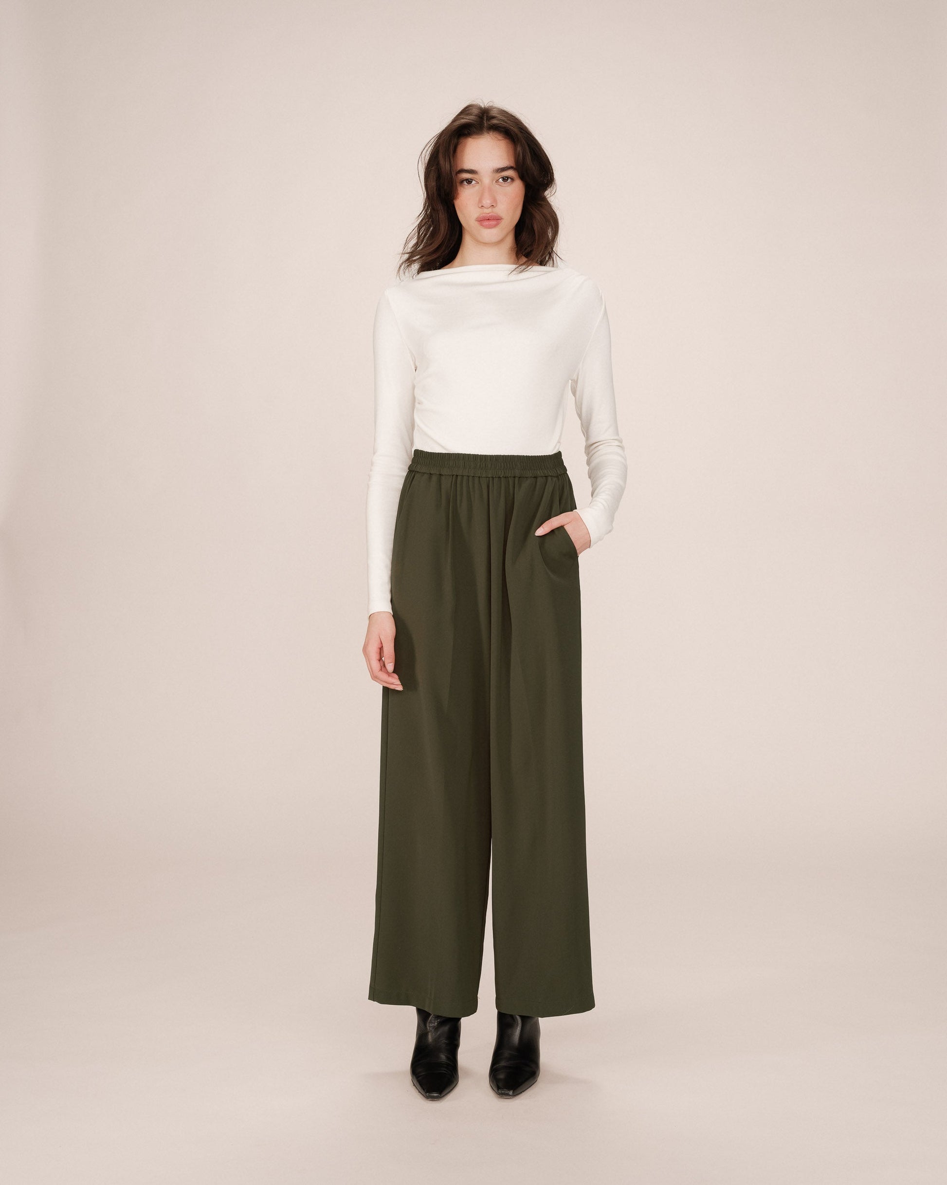 NOBLESSE trousers are wide trousers with an elasticated waist and create. Fluid and light, the NOBLESSE casual trousers is a comfortable piece to wear. This basic of the féminine wardrobe is essential to adopt a casual look.