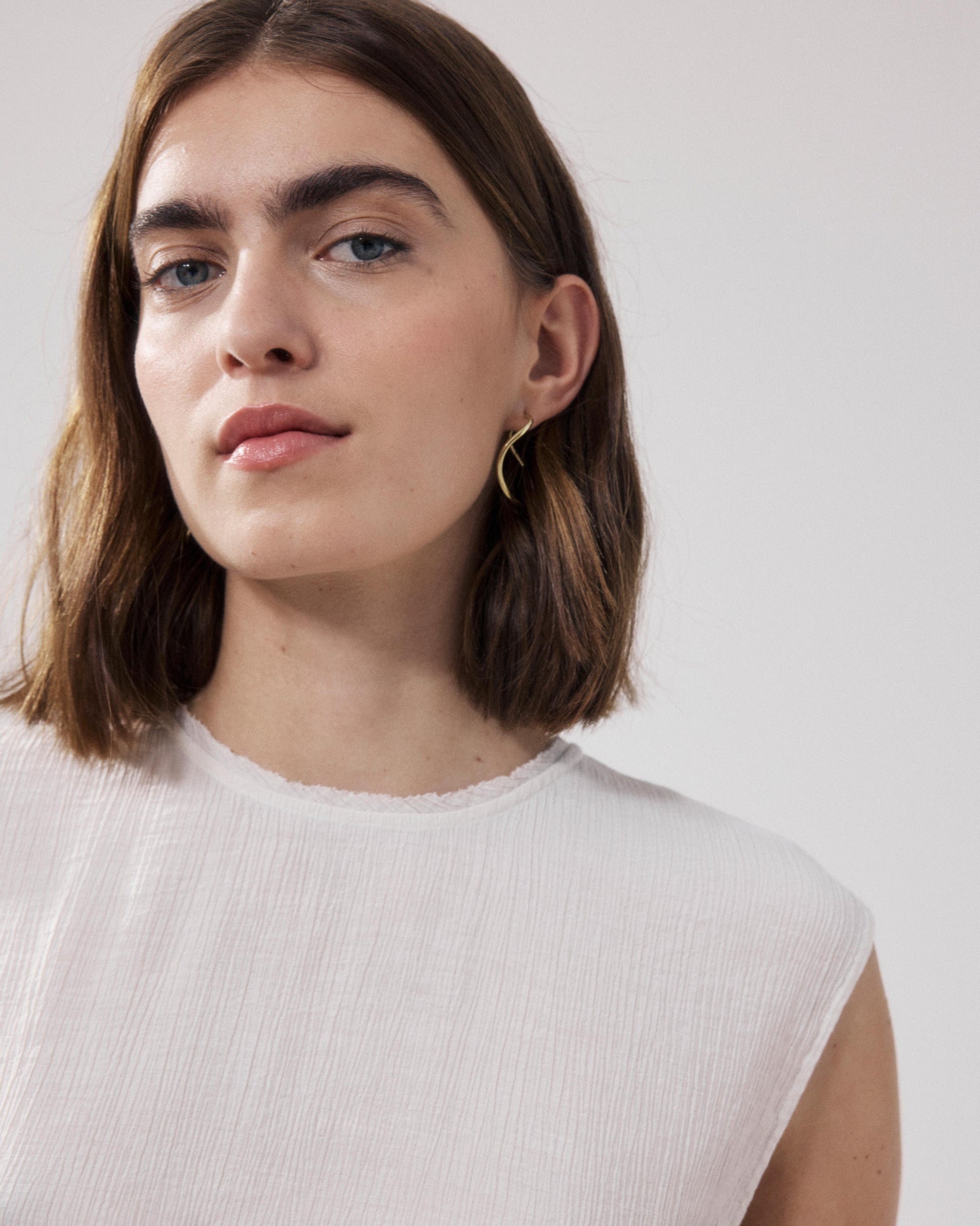 Round-neck women's top with sleeveless detail. Buttoned back drop closure. Two small side slits.