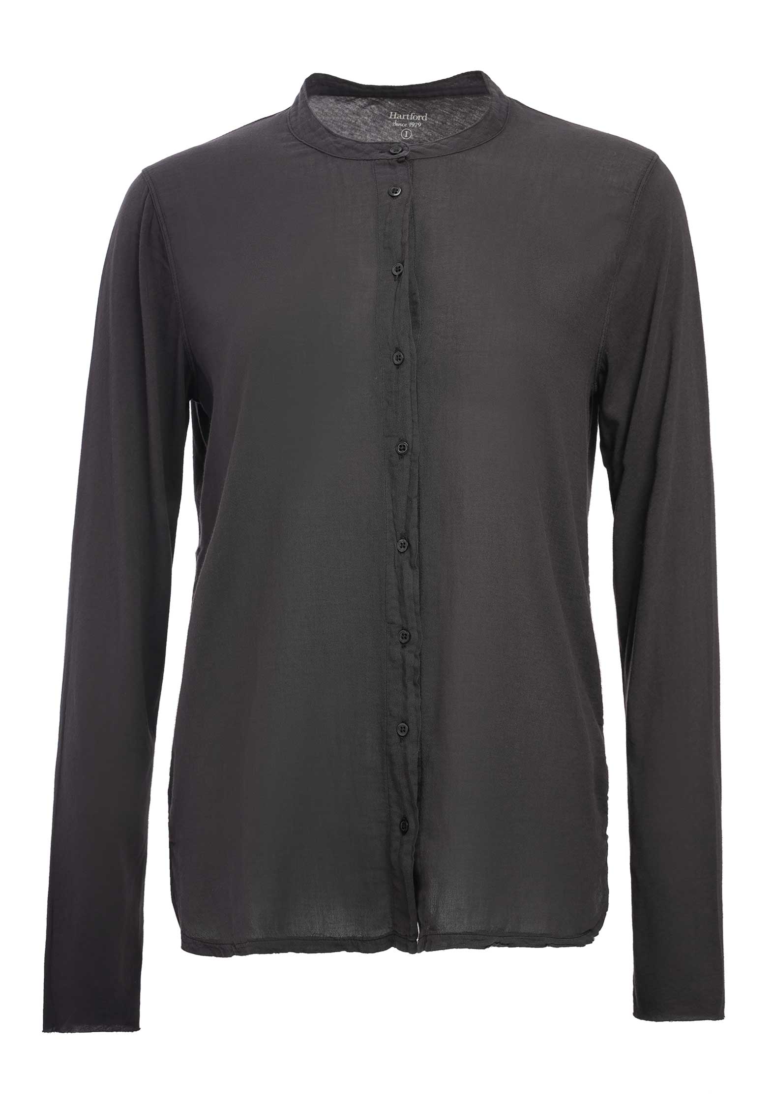 Women's long-sleeved and collarless shirt in double fabric cotton. Visible button placket with mother-of-pearl buttons. Liquette bottom.