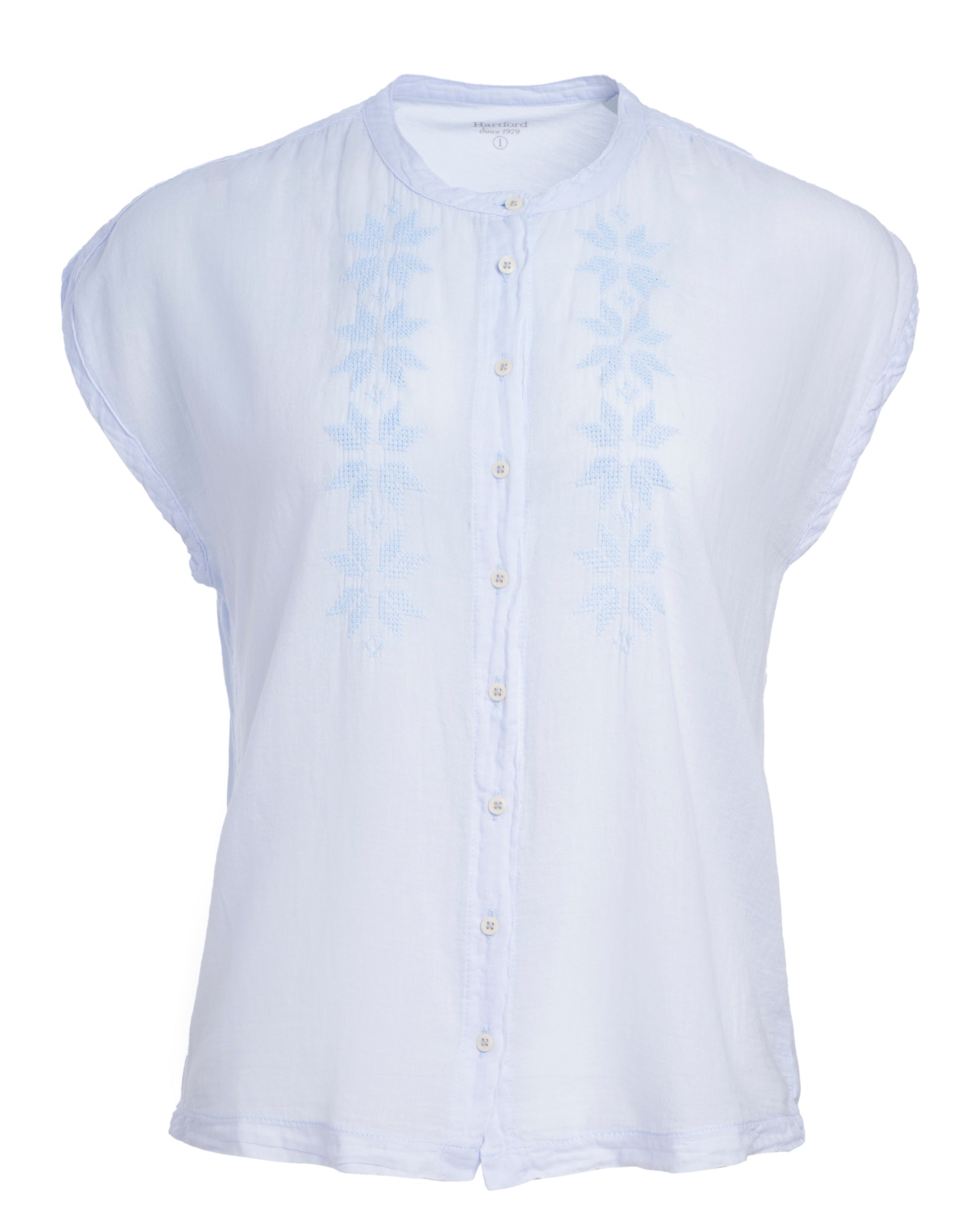 Women's sleeveless cotton bi-Fabric shirt. Collarless. Embroidery details. Visible button placket.