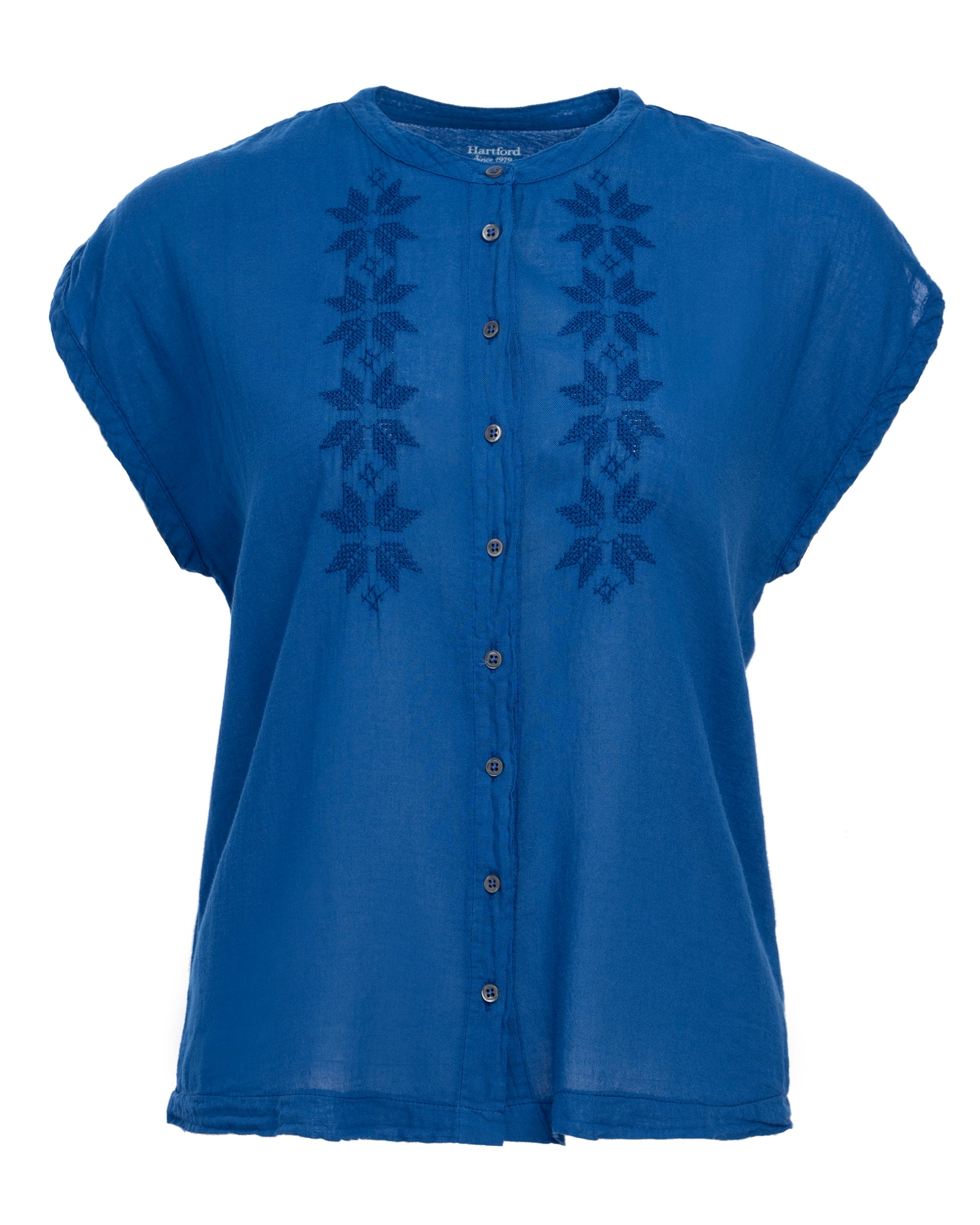 Women's sleeveless cotton bi-Fabric shirt. Collarless. Embroidery details. Visible button placket.