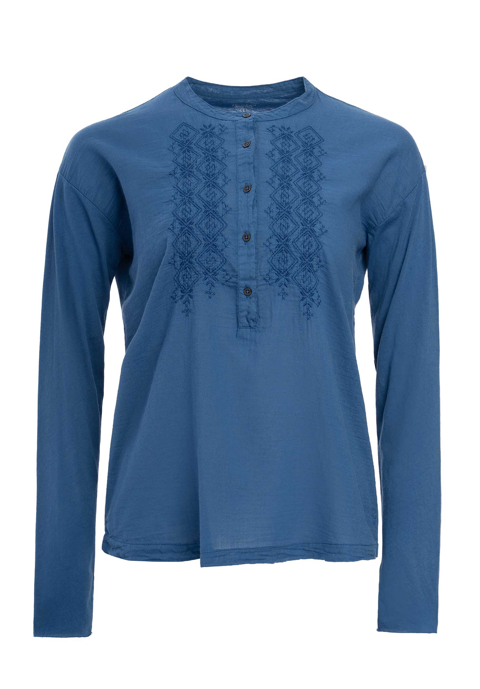 Women's long-sleeved embroidered T-shirt in bi-material cotton. Round collar and visible half-button placket.