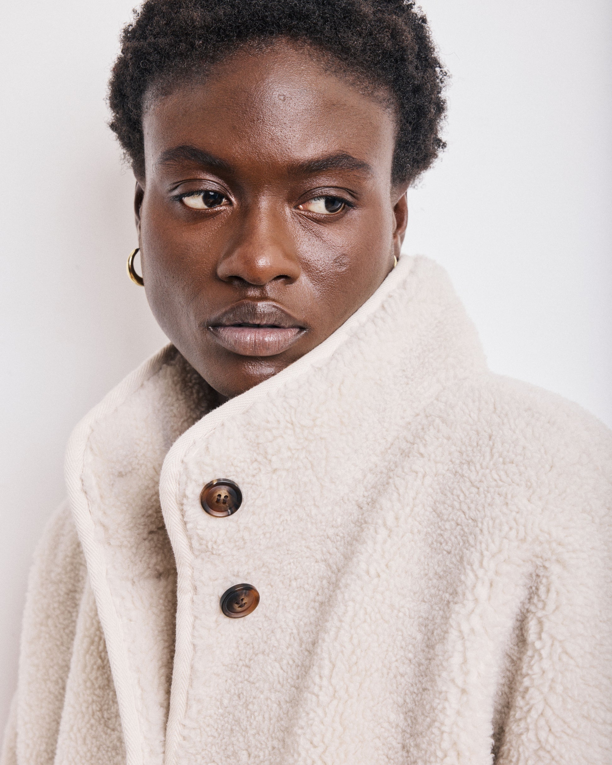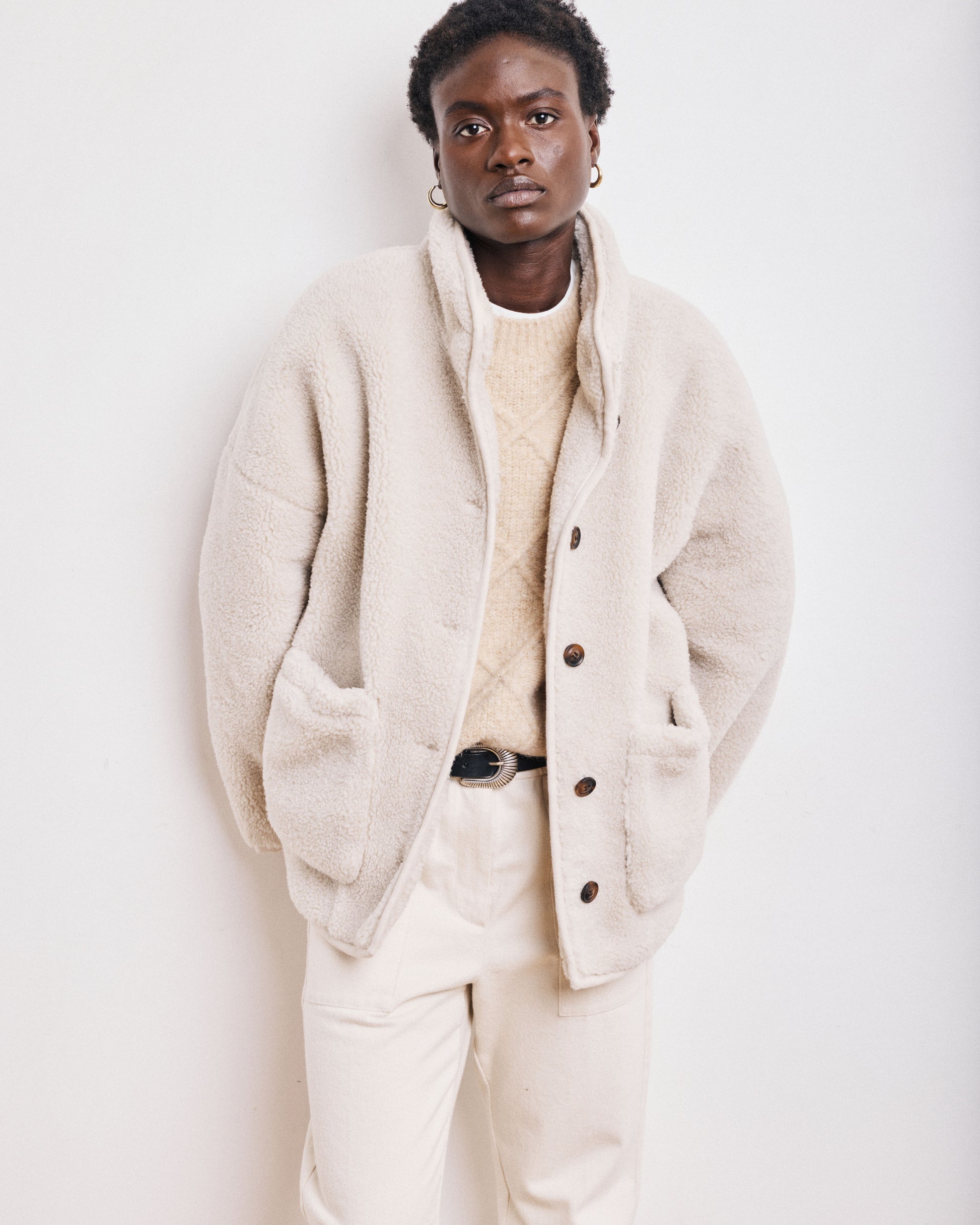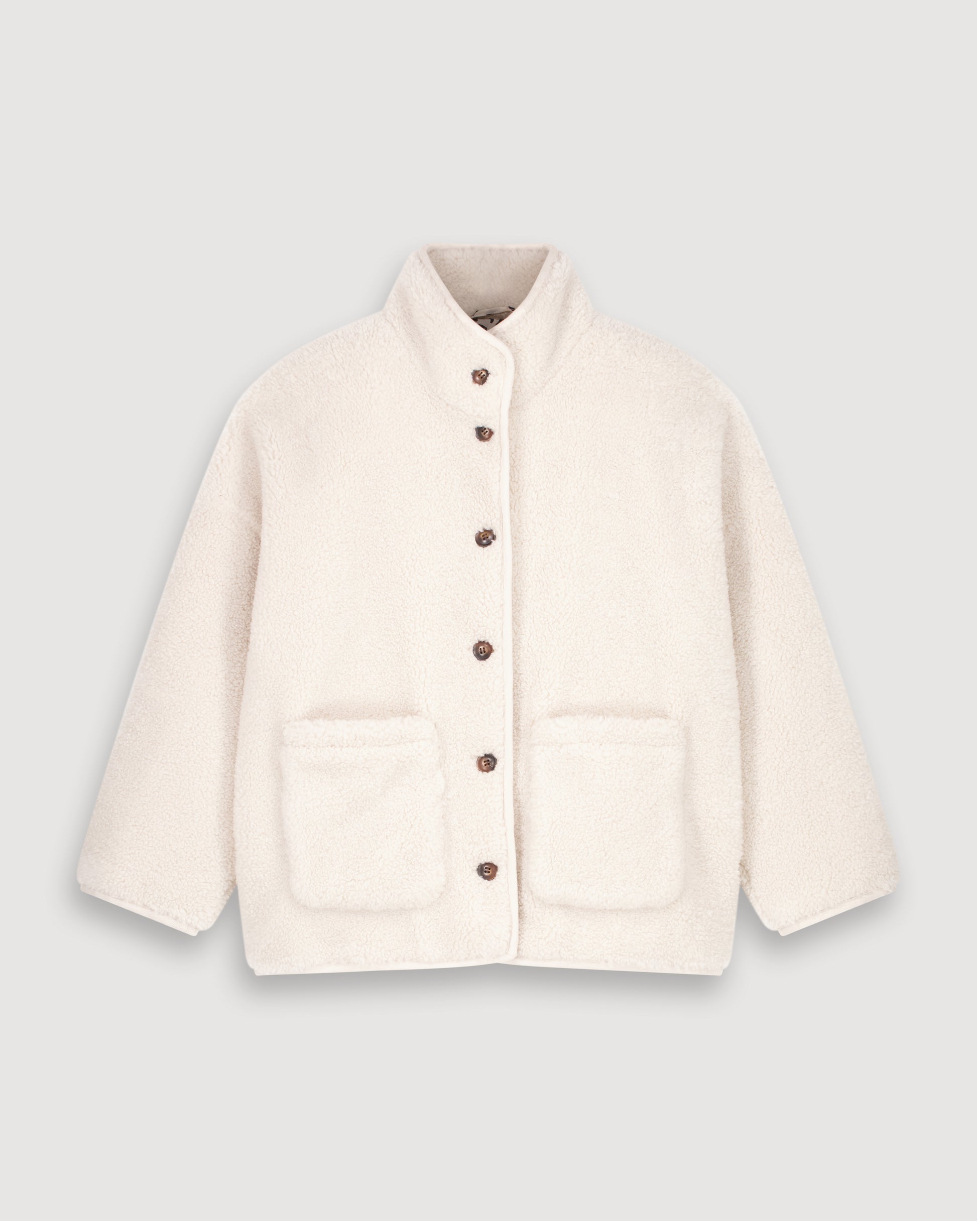 Loose-fitting women's coat with high collar in sherpa. Dropped armholes and two front patch pockets. Exclusive leopard print lining. Bias trim.