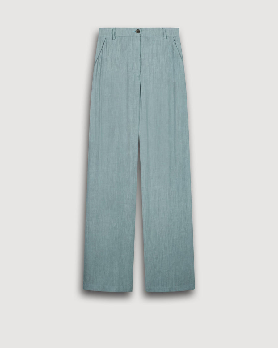 Wide, flowing women's pants in crinkled, plain viscose. High waist, flat waistband with belt loops and zipper. Two side pockets.